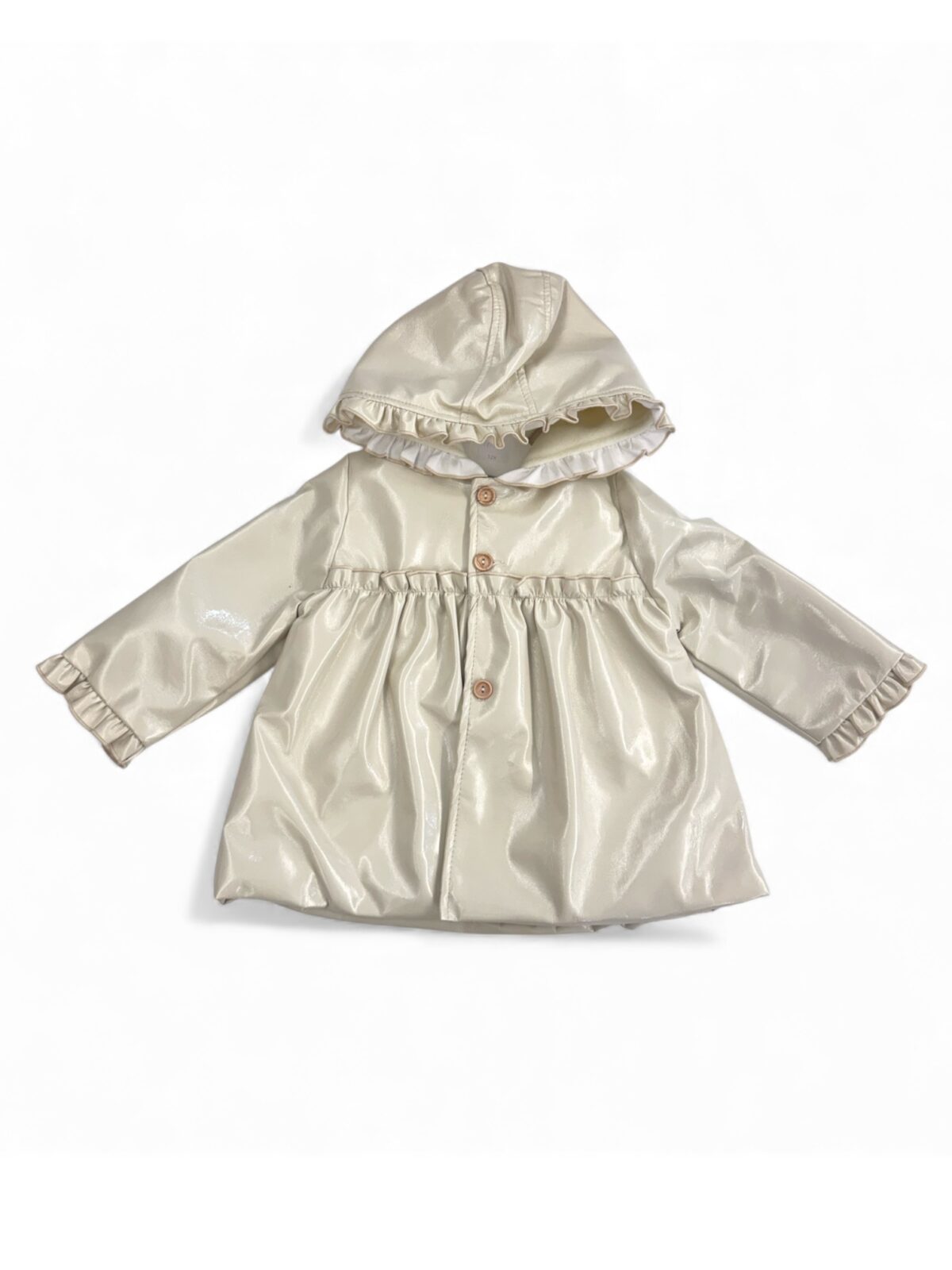 Este abrigo estilo charol en un elegante tono champán  es la prenda perfecta para darle un toque moderno y sofisticado a los días fríos. Diseñado con un acabado brillante que lo hace único, cuenta con una capucha con delicado volante y un interior completamente forrado para ofrecer mayor confort y abrigo. Su silueta con vuelo añade movimiento y un aire encantador, ideal para lucir con estilo en cualquier ocasión.