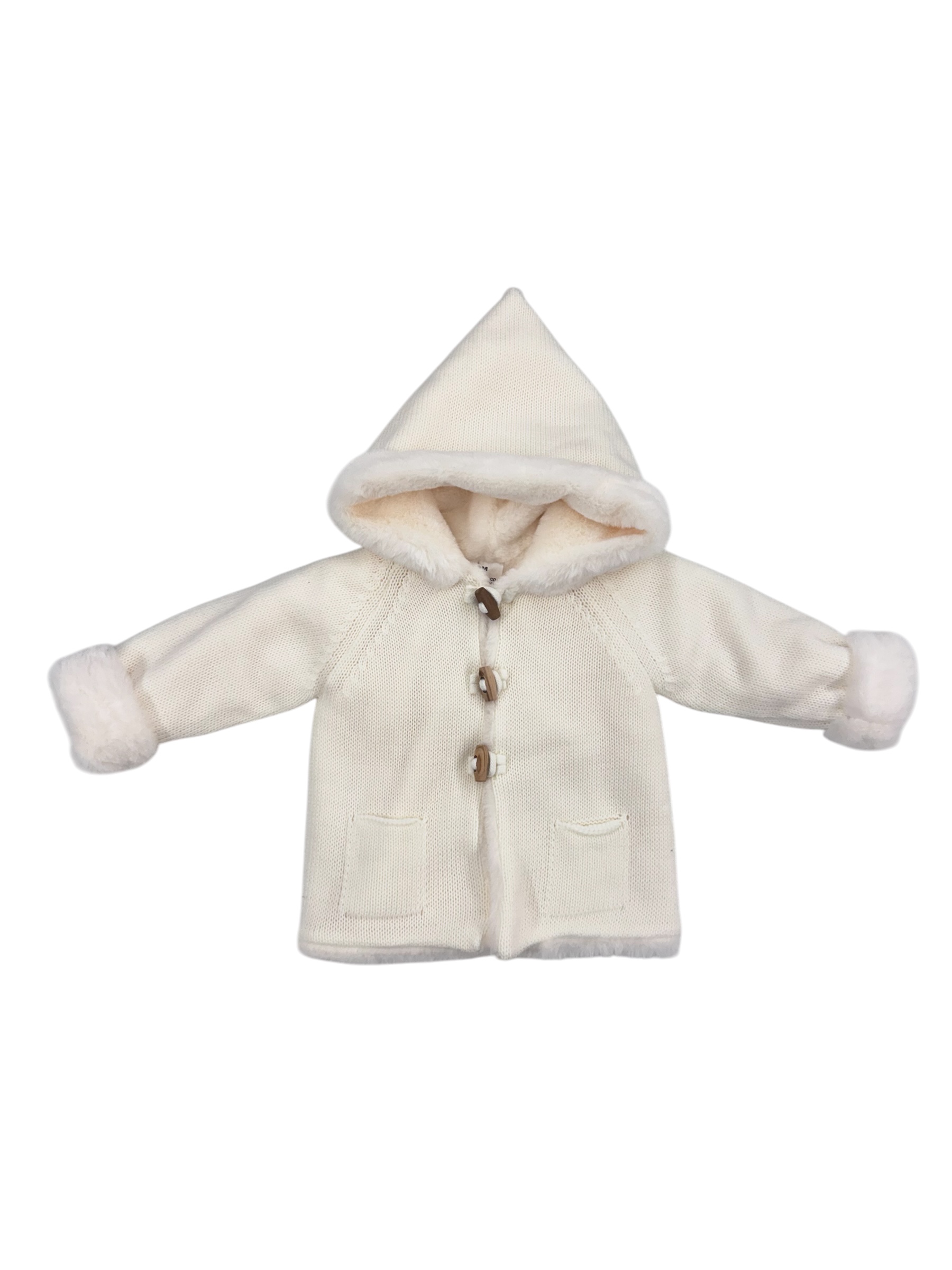 Precioso abrigo de punto con capucha, ideal para los días más fríos. Su interior está completamente forrado con un suave pelo que aporta una calidez extra y una agradable sensación de confort. El diseño incluye cierre con botones tipo trenca y prácticos bolsillos delanteros, además de un acabado cuidado con vuelta en las mangas y borde de pelo visible.