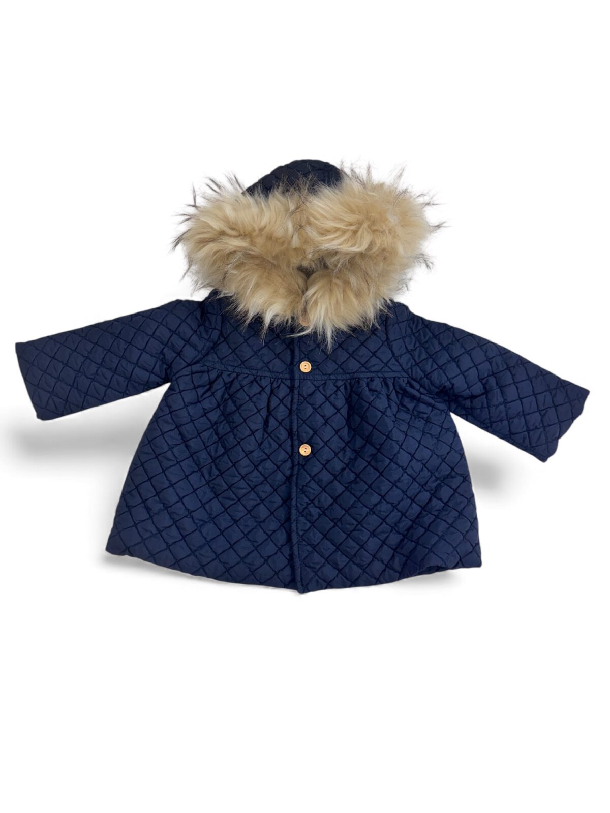 Este abrigo acolchado en color azul marino es la prenda perfecta para mantener a los peques abrigados y cómodos durante los días fríos. Su diseño moderno con costuras en forma de rombos y capucha forrada con suave pelo sintético aporta un toque cálido y elegante. Cuenta con botones frontales y un corte ligeramente acampanado que ofrece una excelente libertad de movimiento.