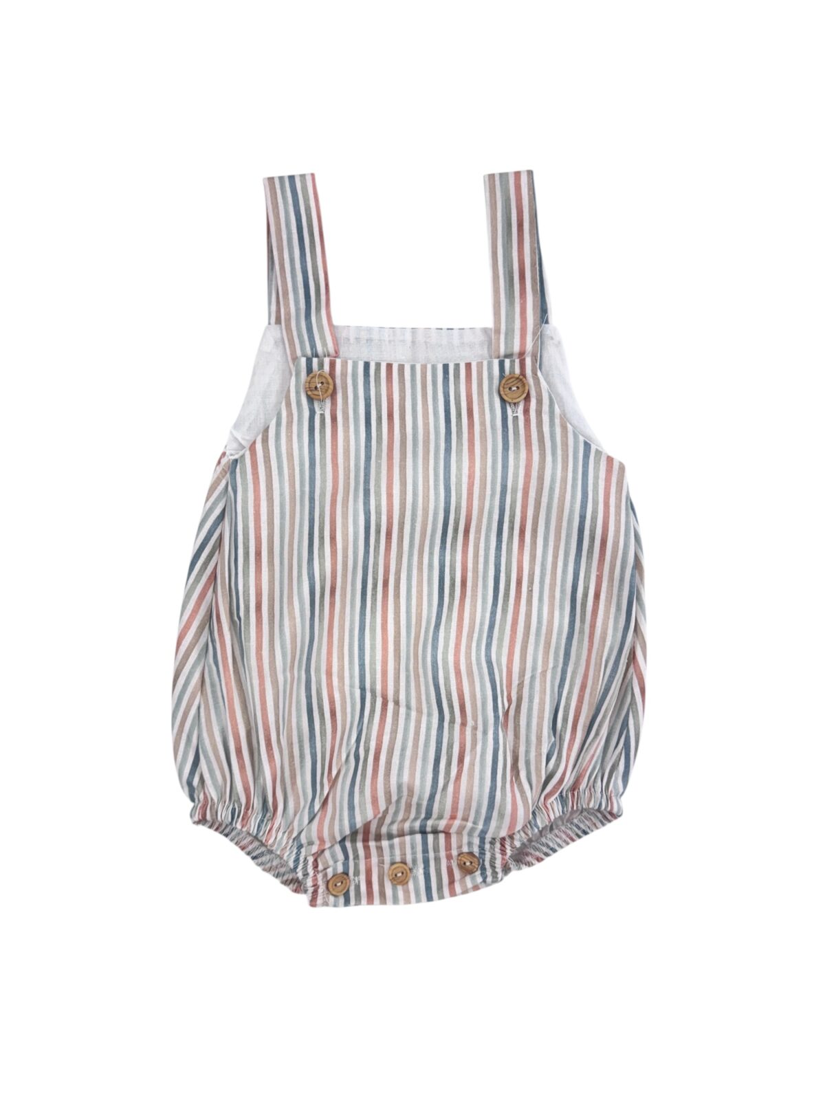 Cuenta con tirantes ajustables con botones en el pecho y cierre con botones en la entrepierna para facilitar el cambio del pañal. Su tejido ligero y transpirable lo convierte en una prenda cómoda .