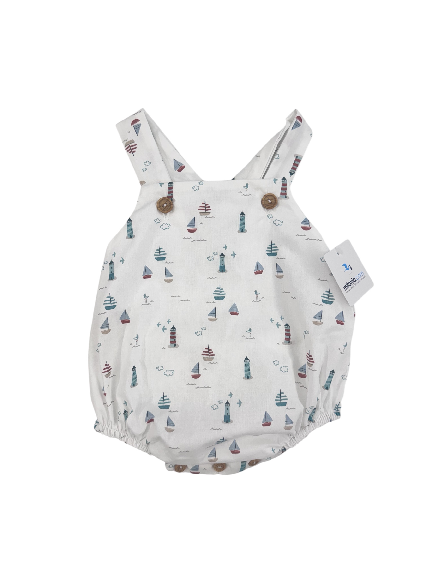 Ranita confeccionada a mano en tejido de algodón con delicado estampado . Diseño cómodo y ligero con botones en la entrepierna para facilitar el cambio de pañal. Ideal para el uso diario en los meses más cálidos.