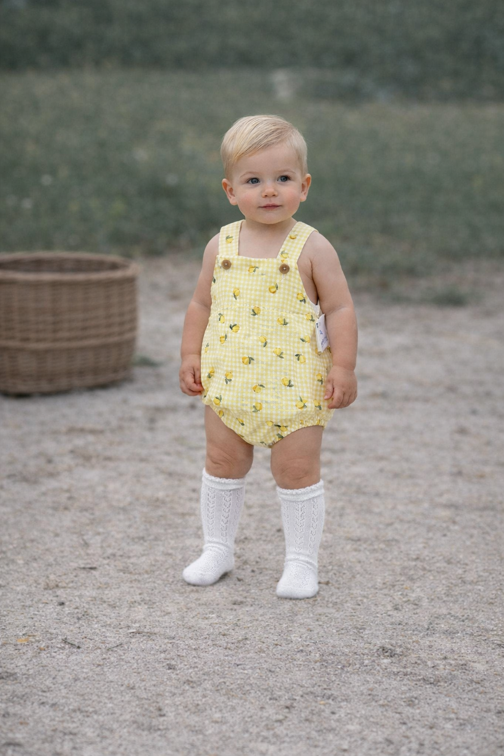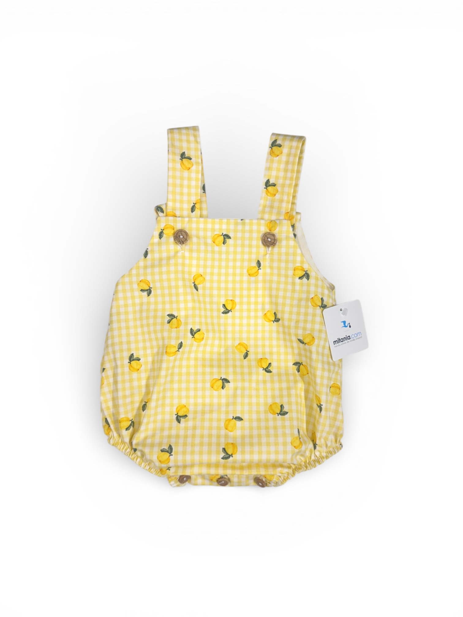 Ranita confeccionada a mano en tejido de algodón con delicado estampado de limones. Diseño cómodo y ligero con botones en la entrepierna para facilitar el cambio de pañal. Ideal para el uso diario en los meses más cálidos.