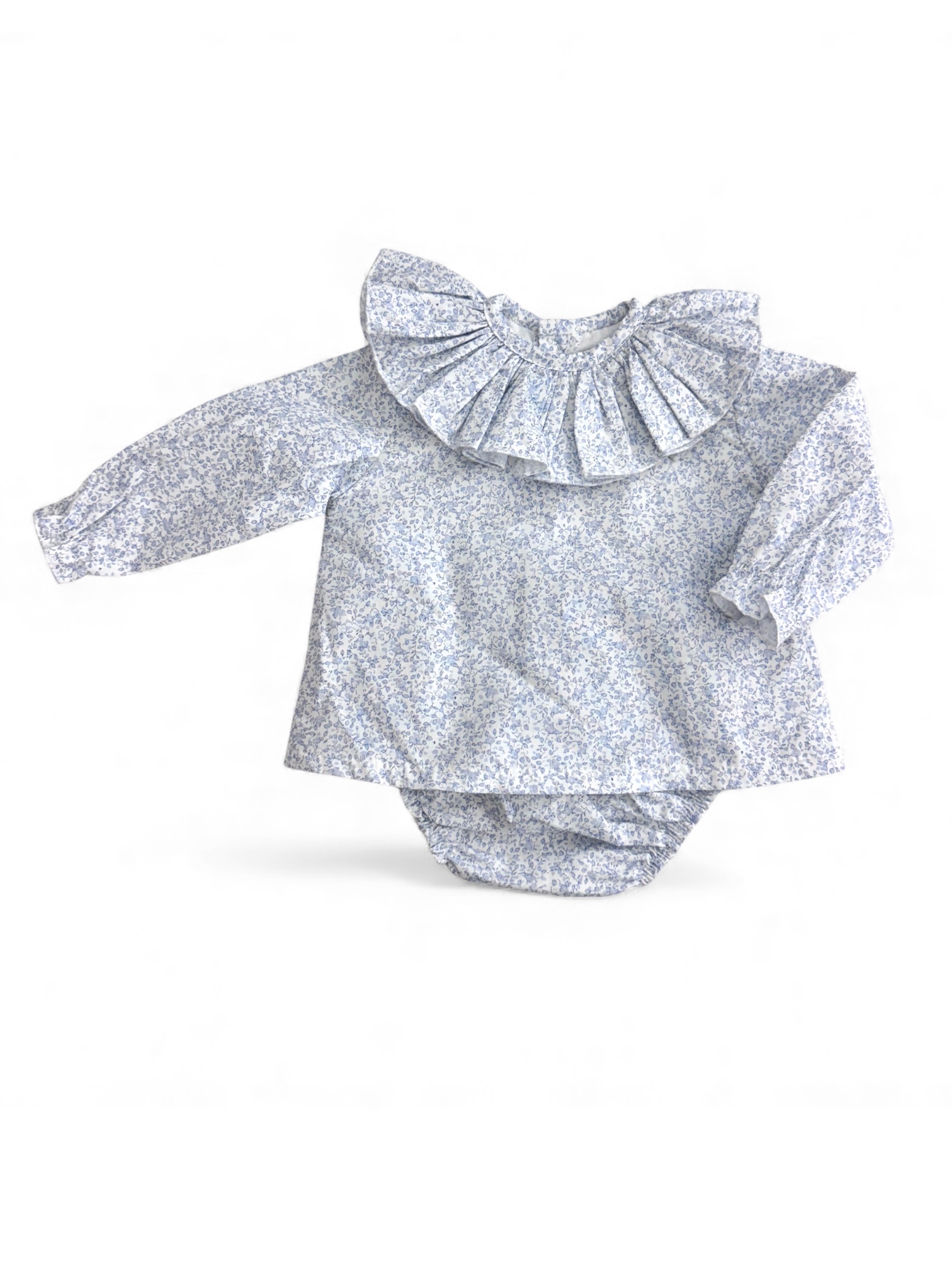 Conjunto para bebé compuesto por blusa de manga larga y braguita a juego. Confeccionado en un delicado tejido estampado floral en tonos azul claro. La blusa destaca por su cuello volante amplio y fruncido, que aporta un toque clásico y elegante. Su diseño cómodo y ligero lo convierte en una prenda ideal para el día a día o para ocasiones especiales.