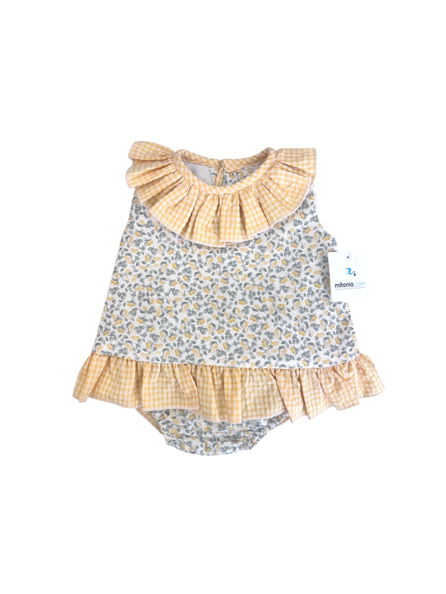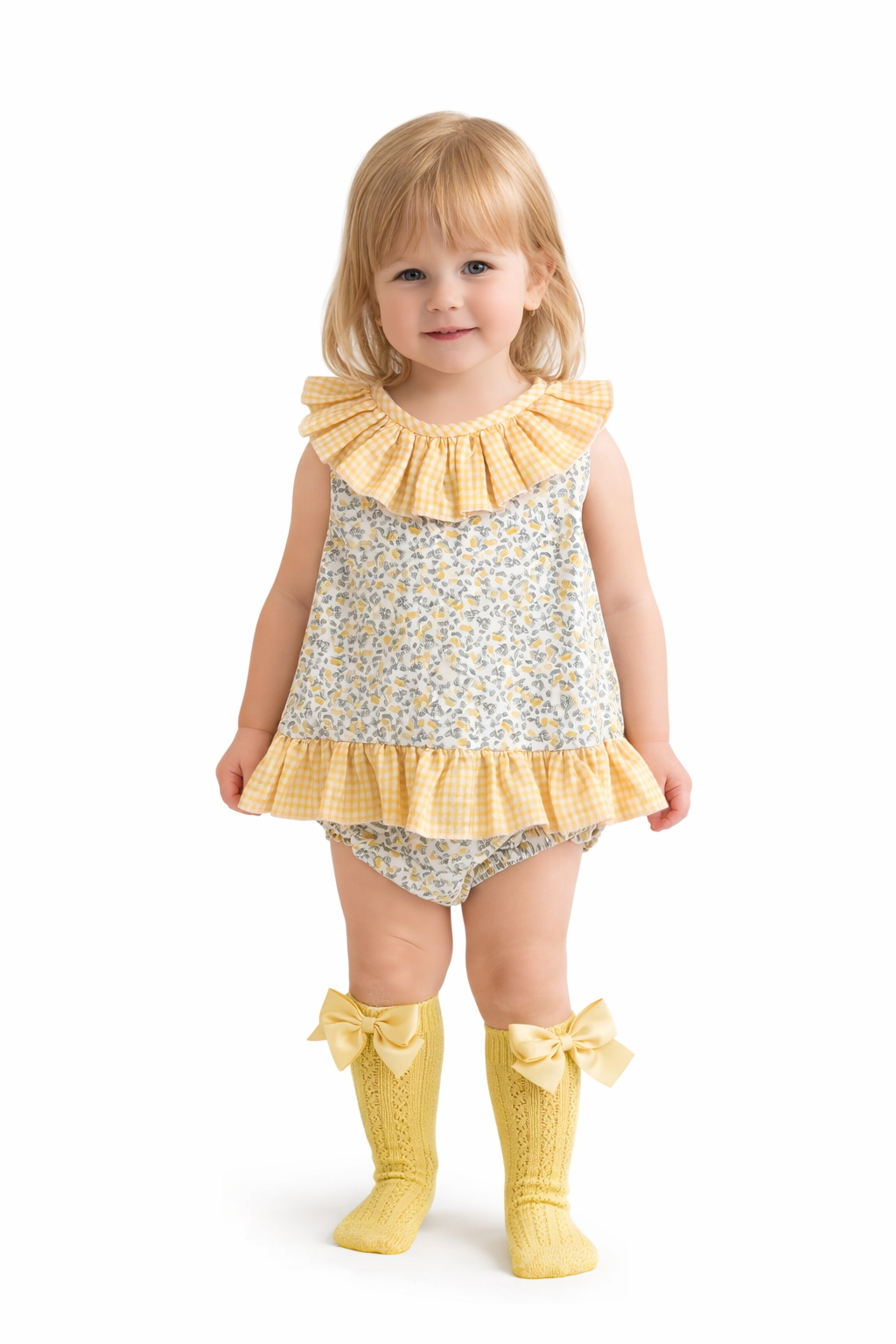 Conjunto infantil compuesto por blusita b con delicado estampado y amplio cuello volante en vichy amarillo, combinado con braguita a juego. Un look fresco y encantador, ideal para los días más cálidos.