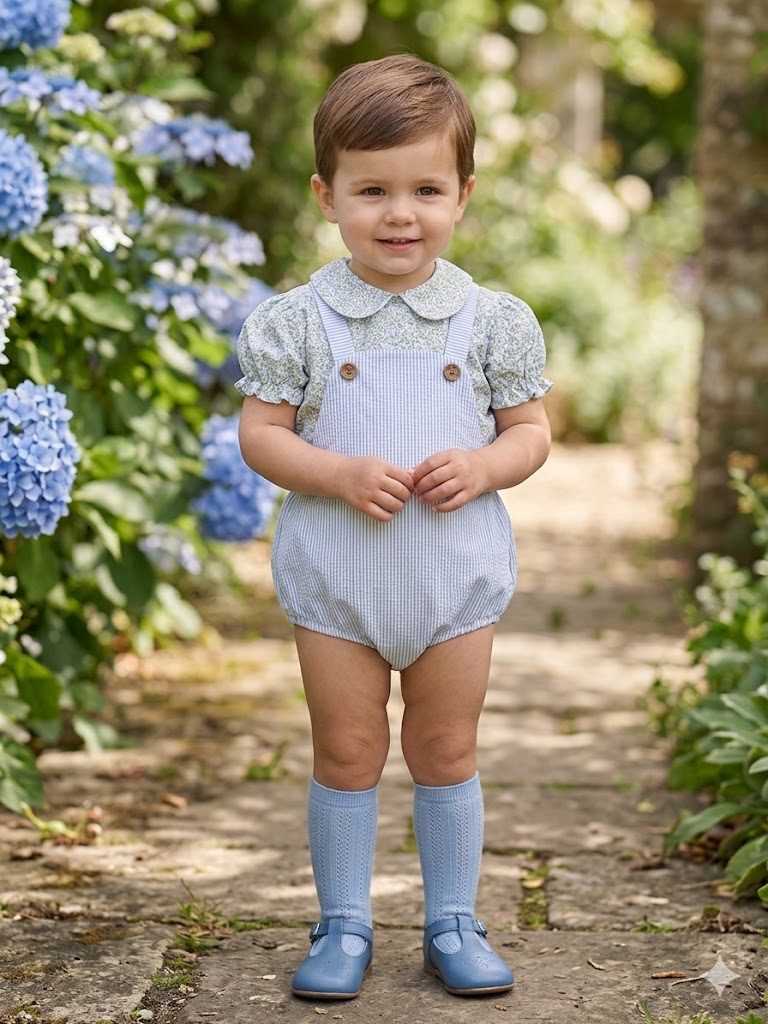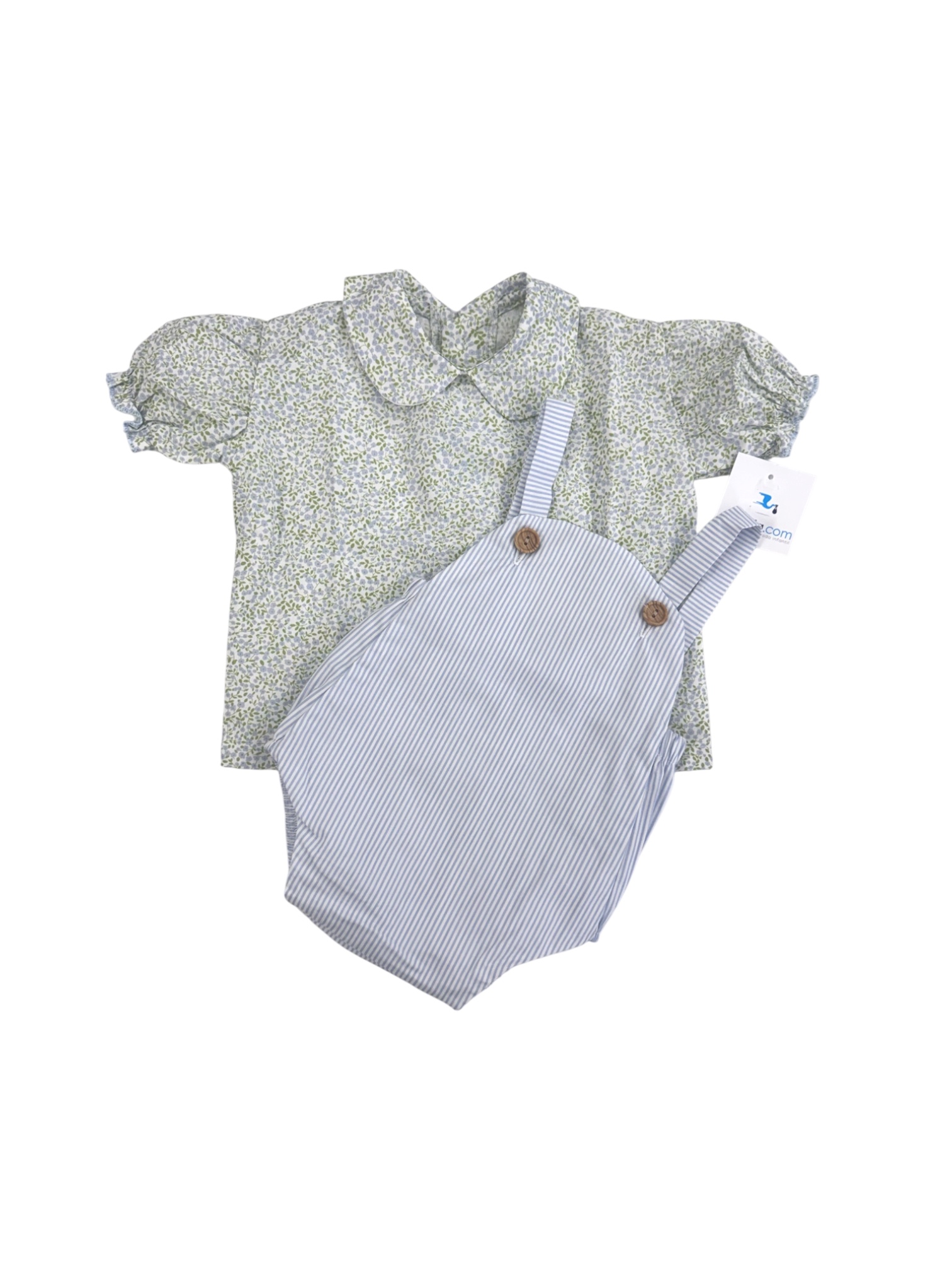 Conjunto artesanal confeccionado en suave algodón, compuesto por blusa estampada de cuello redondo con mangas abullonadas y peto a rayas con tirantes ajustables y botones decorativos. Cómodo, ligero y perfecto para el día a día. Talla fiel a la edad, se recomienda elegir la talla habitual.