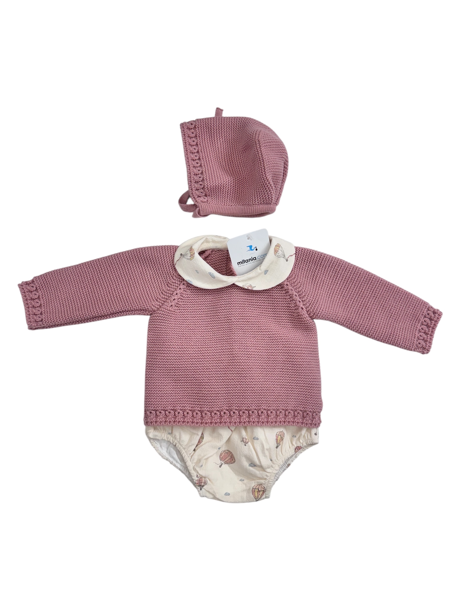 Conjunto unisex en tres piezas con jersey en punto y cubrepañales forrado en tela de algodón. Modelo exclusivo de nuestra colección propia. El talle es un poco justo por eso no se recomienda coger la talla justa a la edad si no una más. Por ejemplo para 12 meses una 18.