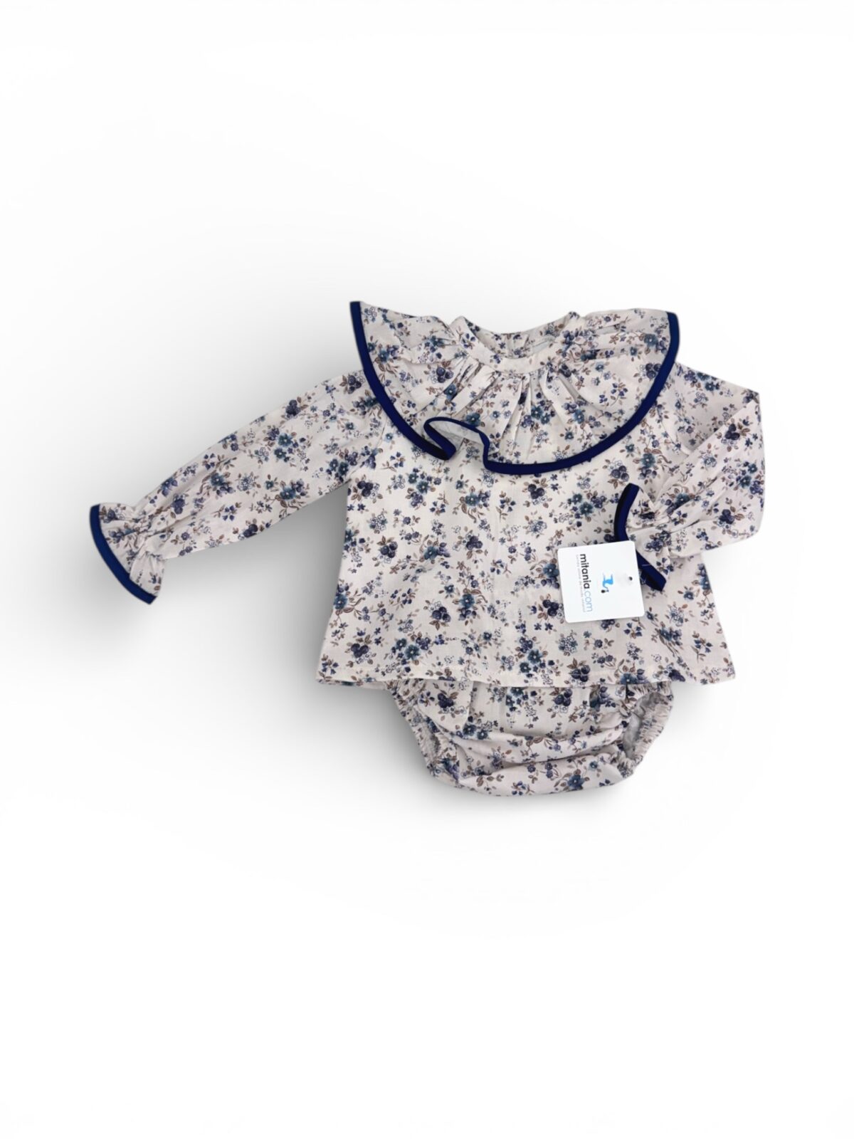 Conjunto artesanal compuesto por blusa de manga larga con volante en el cuello y braguita a juego, confeccionado en suave tejido de algodón con delicado estampado floral y remates en contraste. Incluye forro interior para mayor confort y mejor caída.