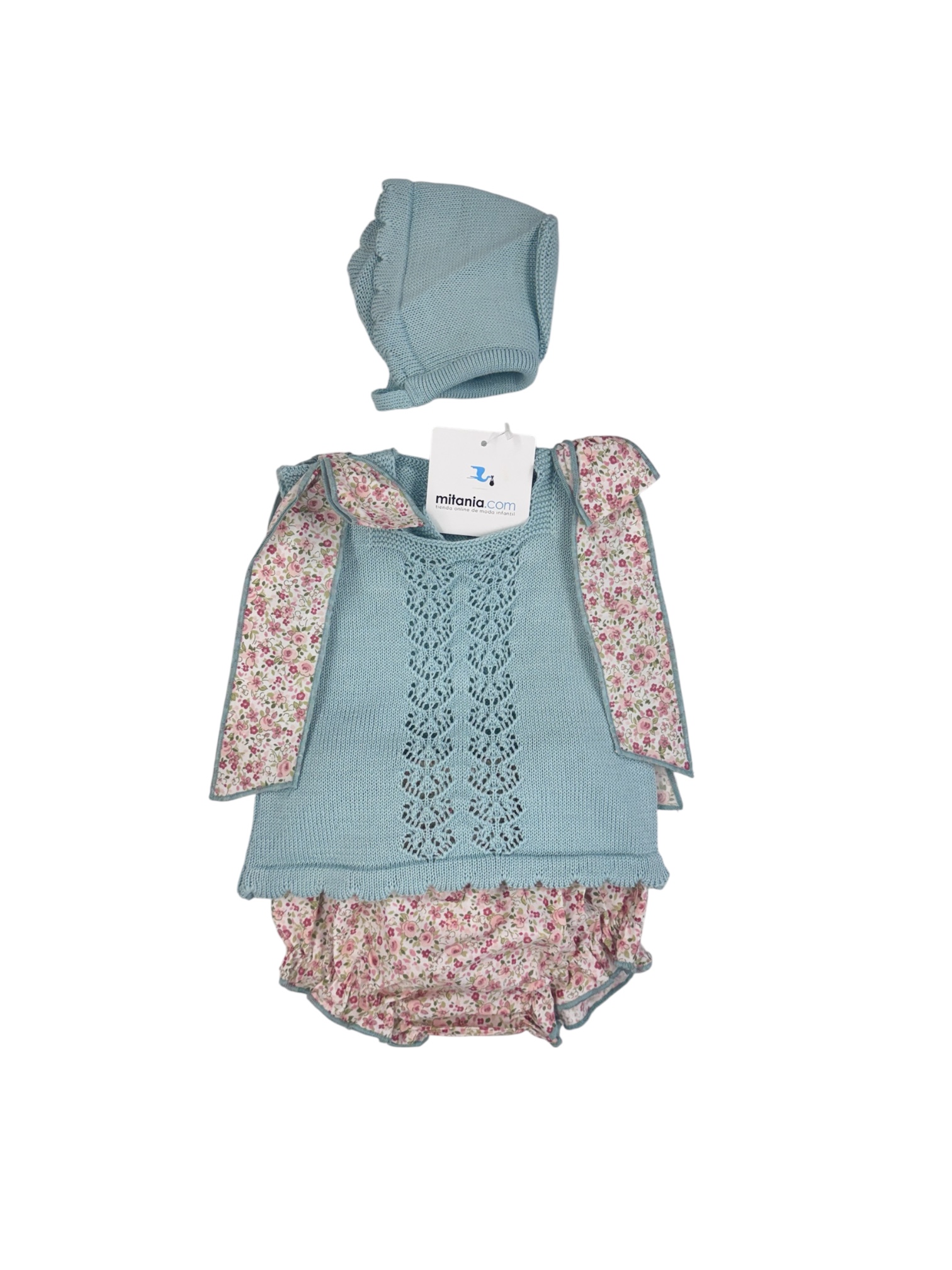 Conjunto de punto en tono verde agua  compuesto por jersey calado con detalle central, braguita con volante en estampado floral y capota a juego. Incluye lazadas laterales en tejido floral que aportan un acabado delicado y romántico, ideal para ocasiones especiales o el día a día con estilo.