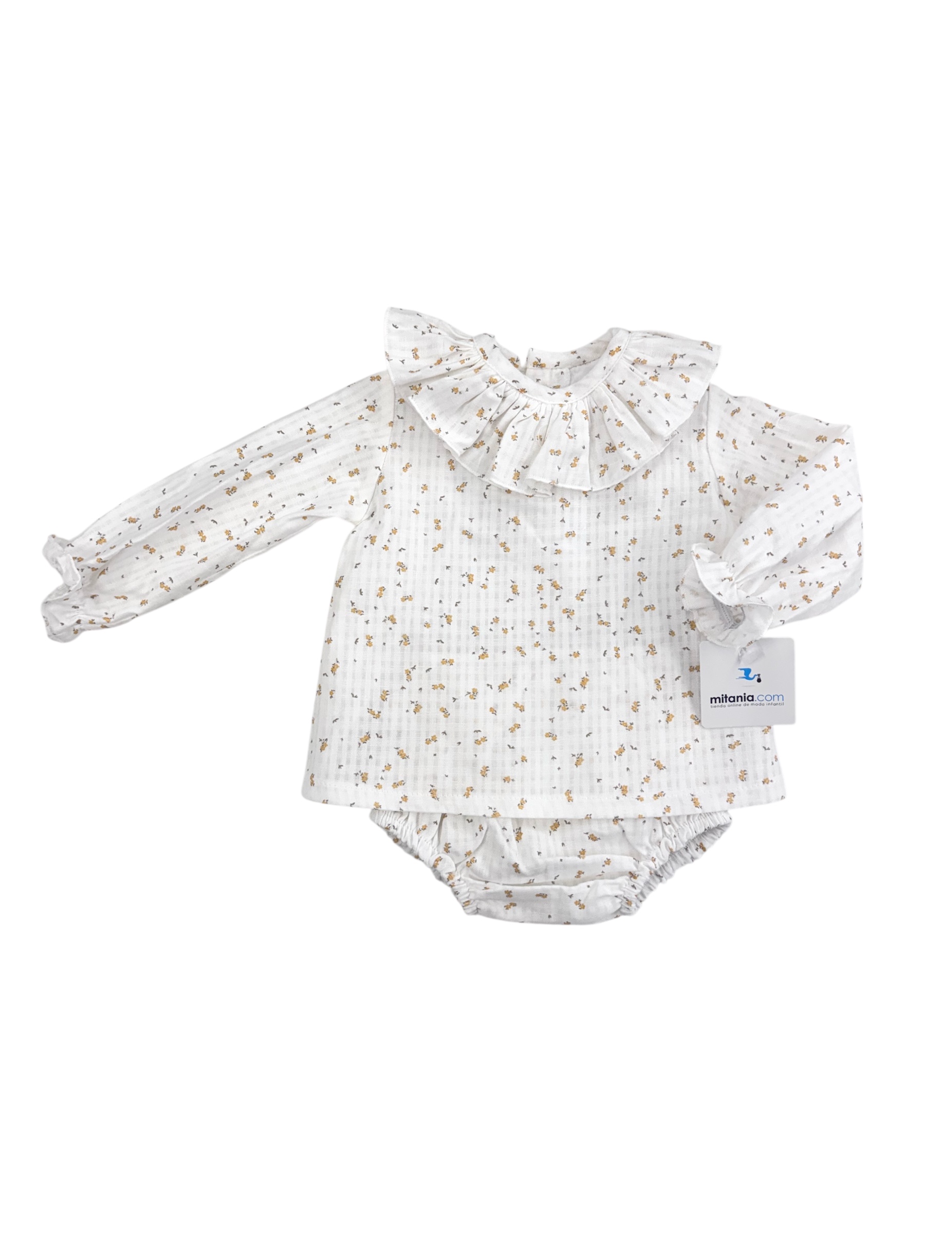 Precioso conjunto confeccionado a mano con tejidos suaves y de alta calidad. La blusa de manga larga destaca por su cuello volante y su delicado estampado floral en tonos suaves sobre fondo blanco. Su diseño clásico y elegante la convierte en una prenda ideal para cualquier ocasión.