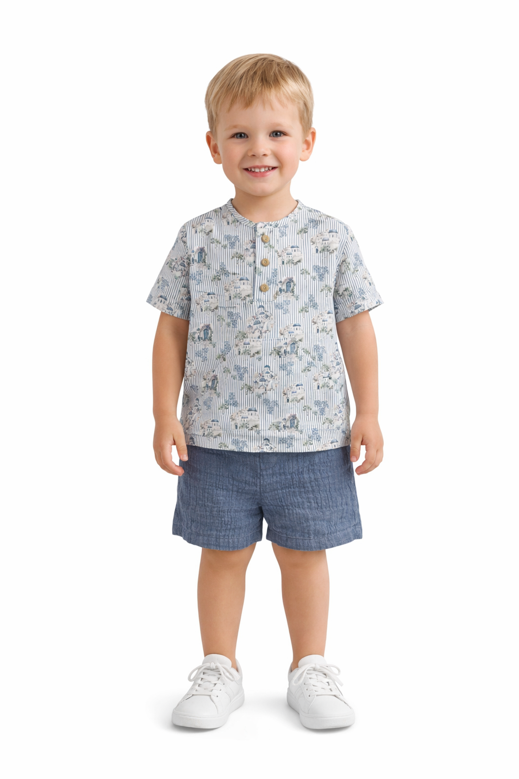 Conjunto infantil confeccionado a mano, compuesto por camisa estampada de manga corta con botones frontales y bolsillo delantero con short azul de tejido ligero. Diseño cómodo y fresco, ideal para el día a día o ocasiones especiales.