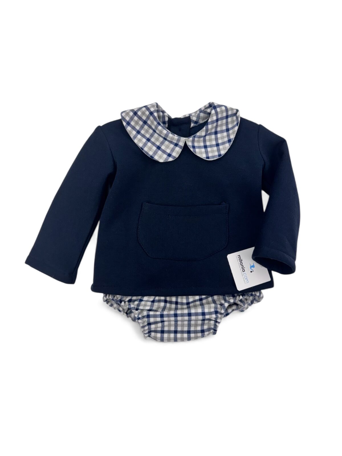 Conjunto de sudadera confeccionado a mano, compuesto por una sudadera en color azul marino con bolsillo frontal y un cuello estampado en cuadro vichy azul y blanco que aporta un toque clásico y elegante. Incluye también la braguita a juego con el mismo estampado vichy para un acabado perfectamente coordinado.