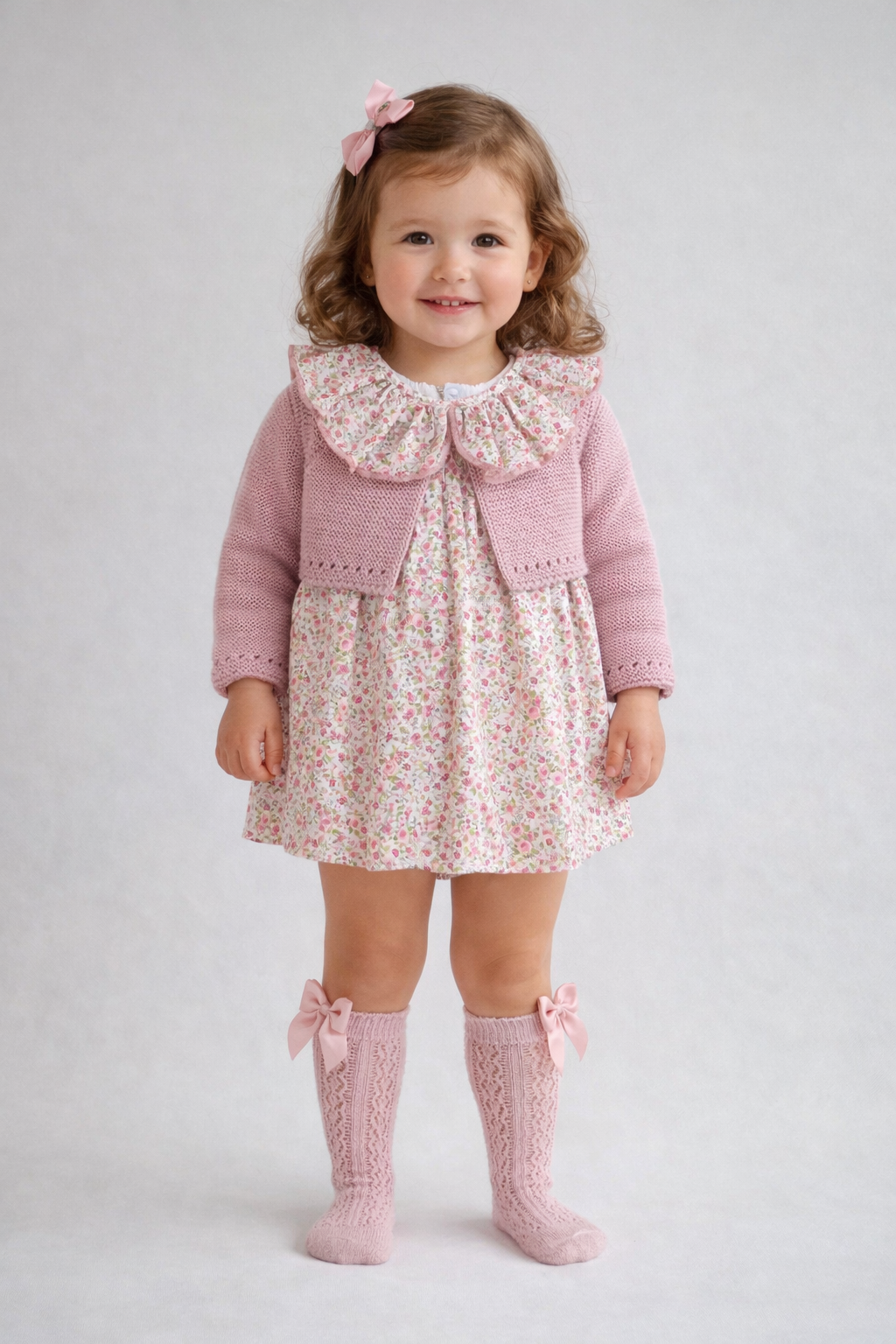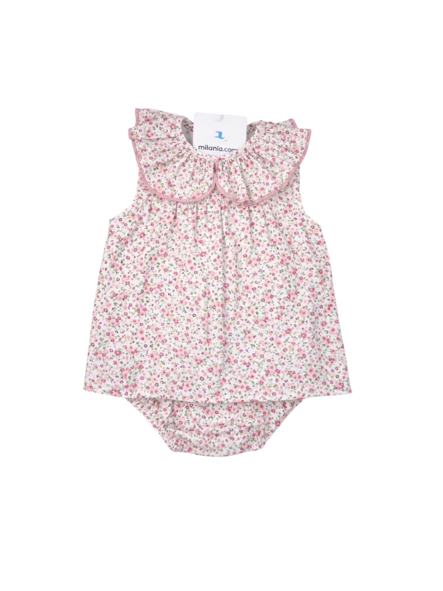 Conjunto para bebé compuesto por blusa sin mangas y cubrepañal a juego. Presenta un delicado estampado floral en tonos rosas y verdes sobre fondo blanco, con amplio cuello volante ribeteado que aporta un toque romántico y encantador. Confeccionado en tejido ligero y suave para mayor comodidad, es ideal para los días cálidos.
