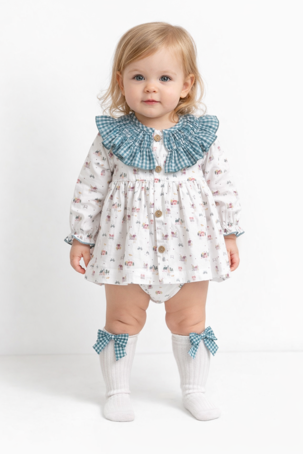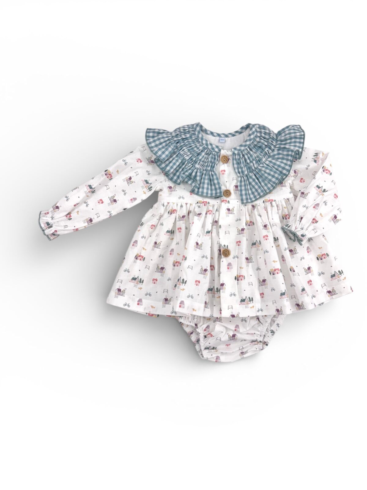 Jesusito confeccionado a mano, elaborado en suave algodón con delicado estampado infantil. Destaca por su cuello volante de cuadro vichy y botones de madera natural que aportan un toque artesanal y elegante. Incluye braguita a juego para mayor comodidad. Tallaje normal, se recomienda elegir la talla habitual.