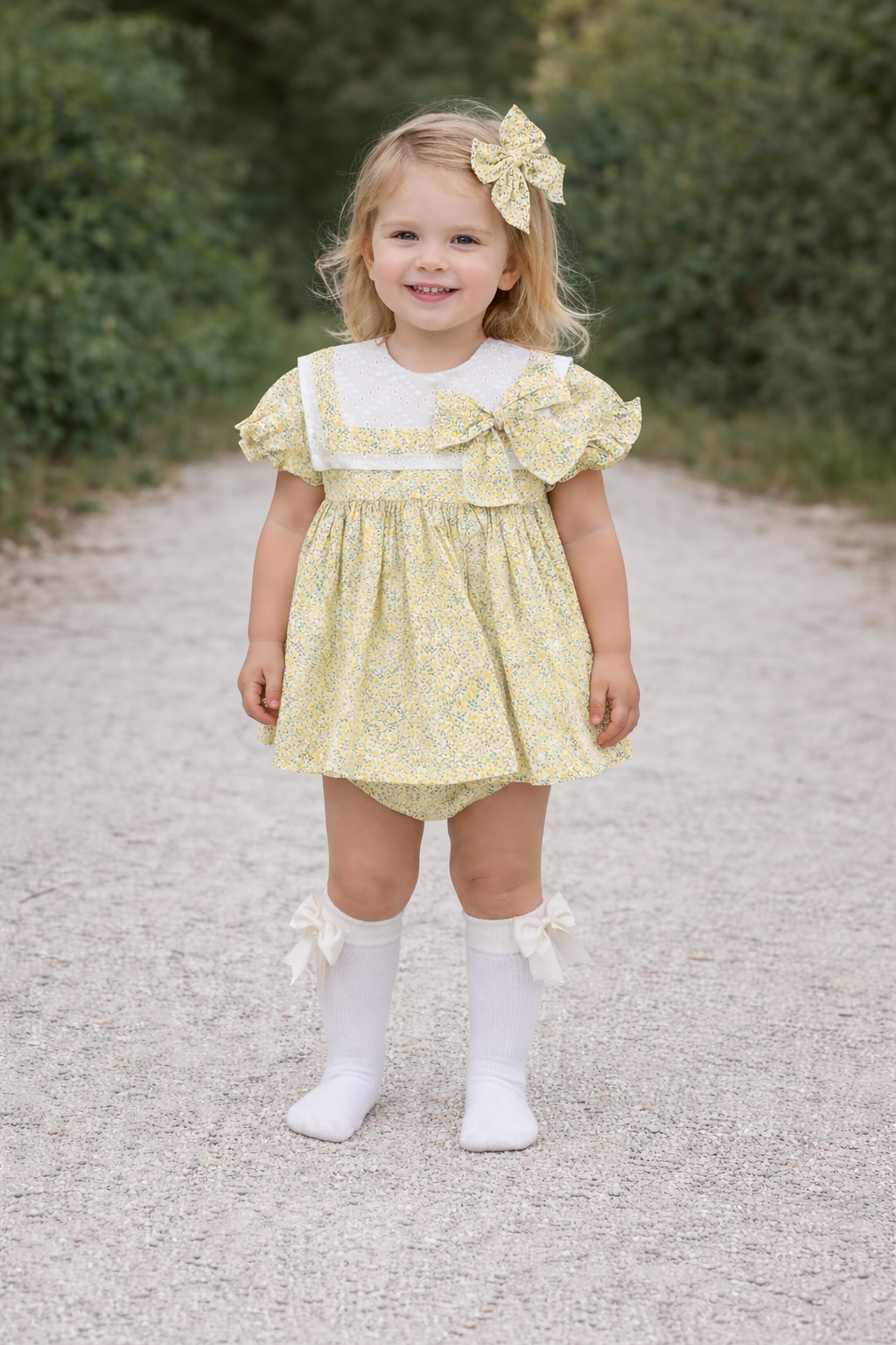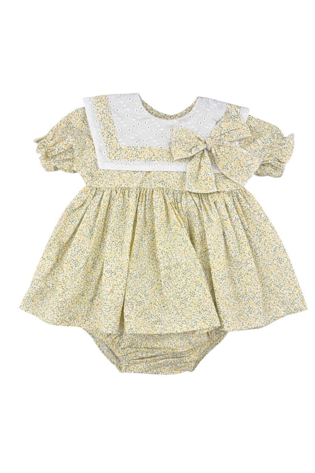 Jesusito infantil en tonos amarillo con estampado delicado y corte amplio. Confeccionado a mano en tejido de algodón , destaca por su cuello babero . Un diseño dulce y elegante, ideal para un look clásico y veraniego.