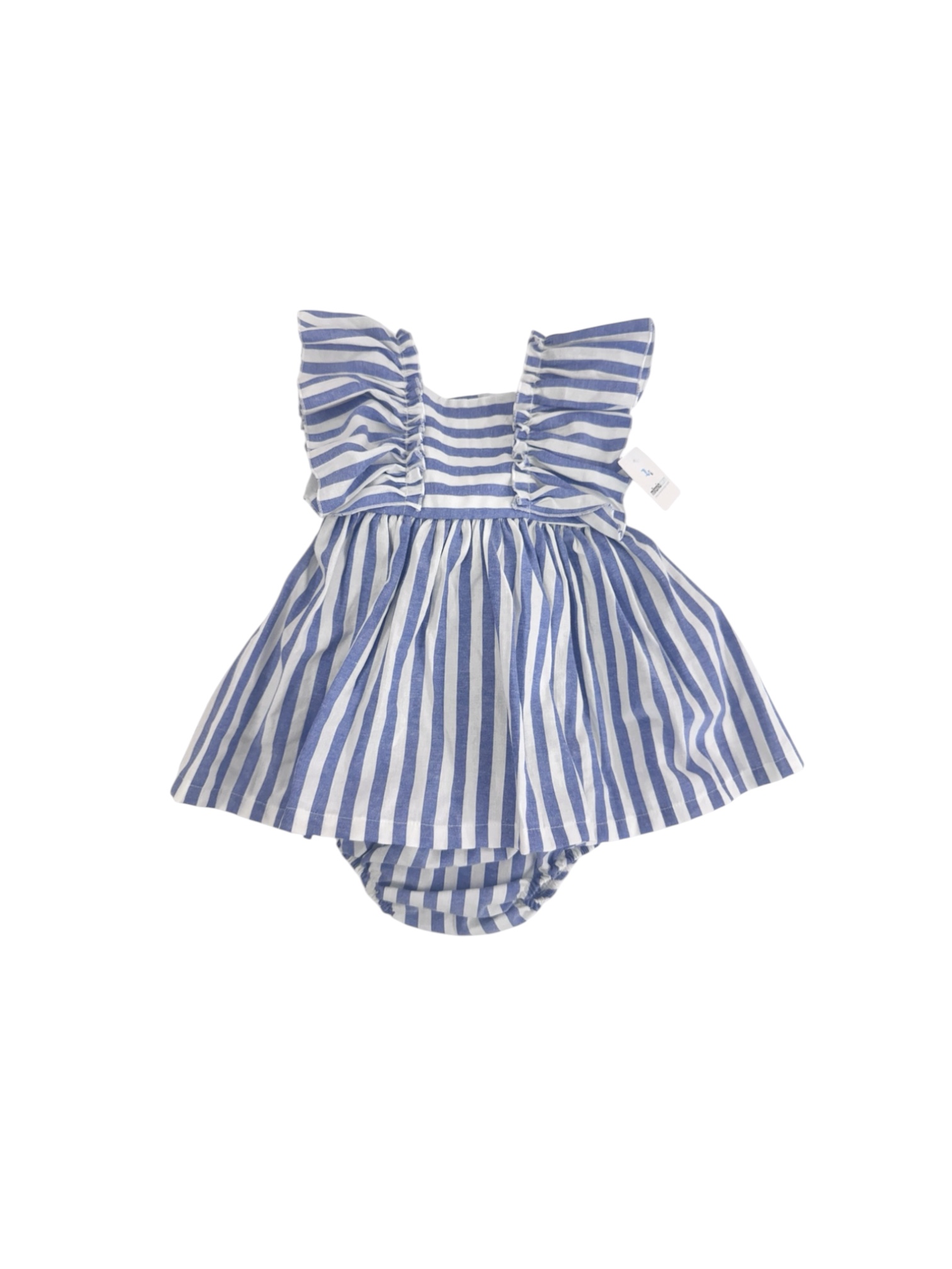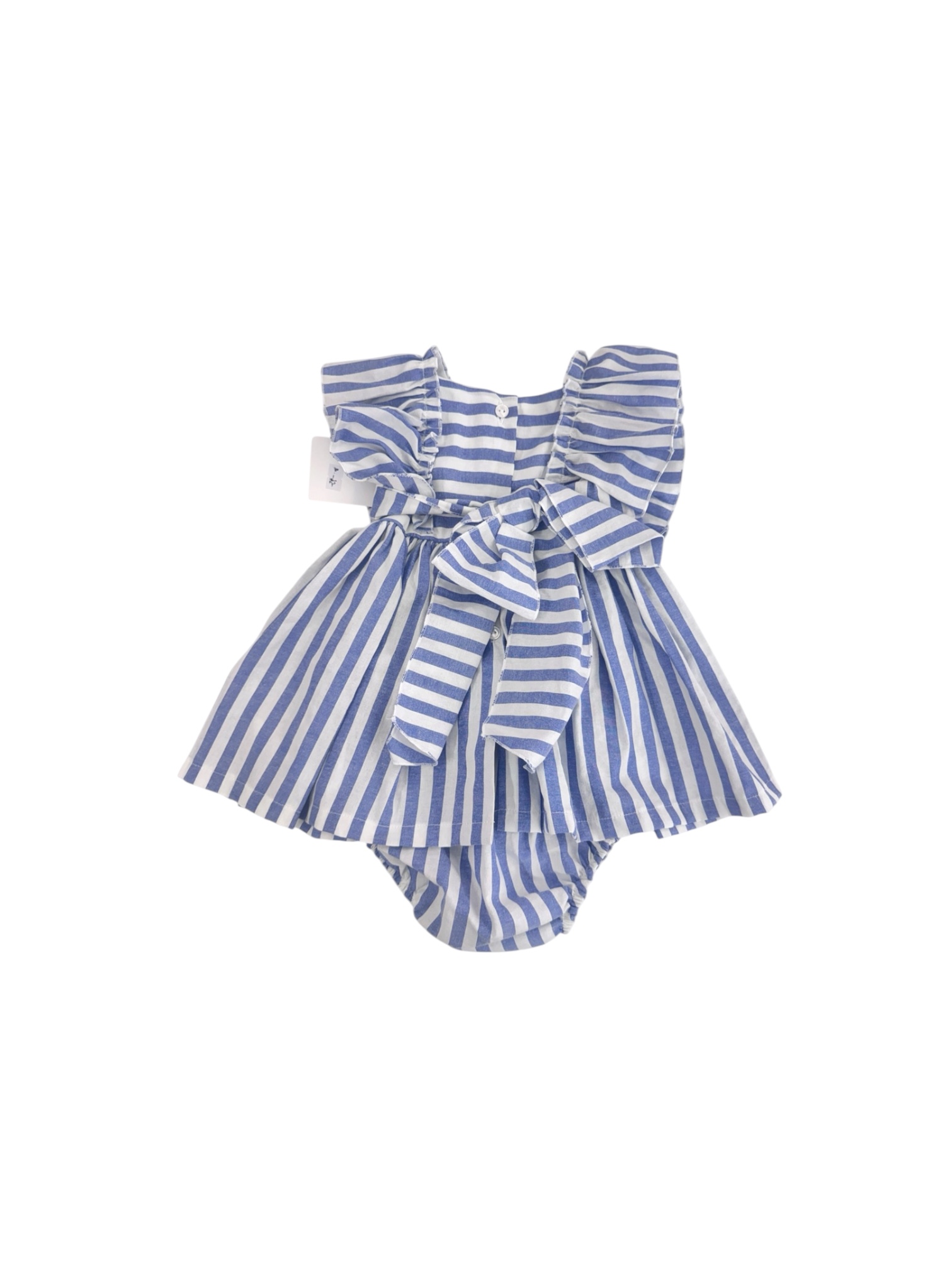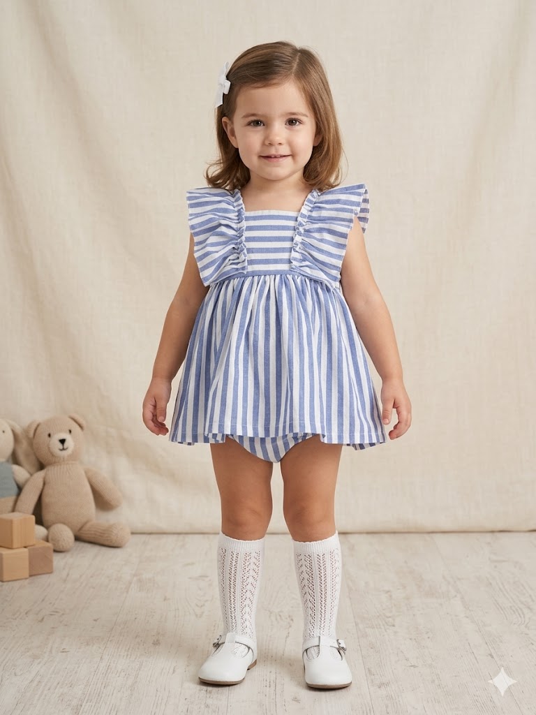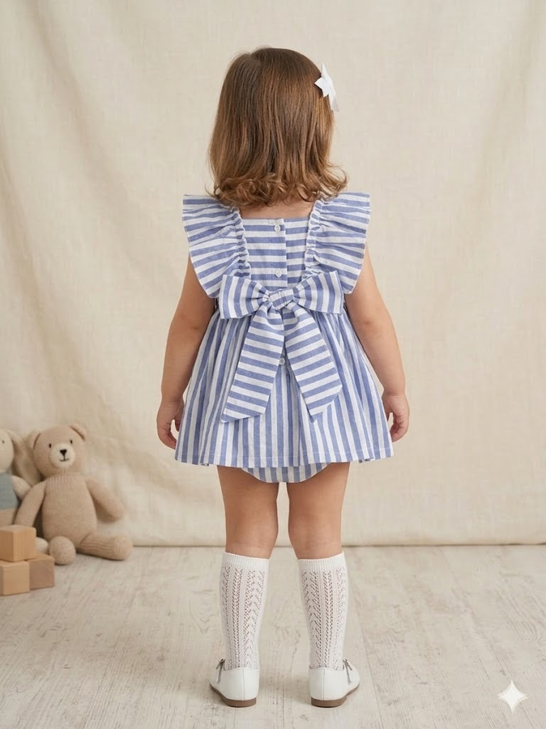 Diseño: Estampado de rayas verticales en azul y blanco. Presenta encantadores volantes en los tirantes . La espalda cuenta con una apertura parcial con botones y una lazada en el mismo tejido.