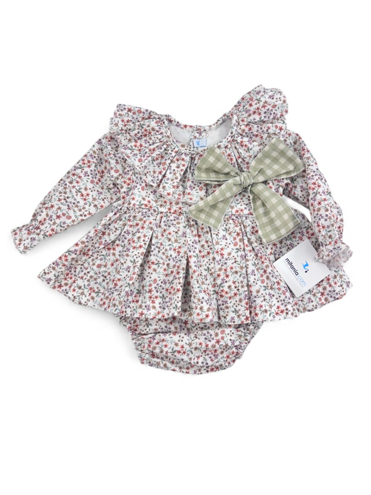 Incluye una braguita a juego y destaca por su gran lazo en vichy verde, que aporta un toque único y muy estiloso al conjunto. Su tejido es suave y cómodo para la piel de tu bebé.