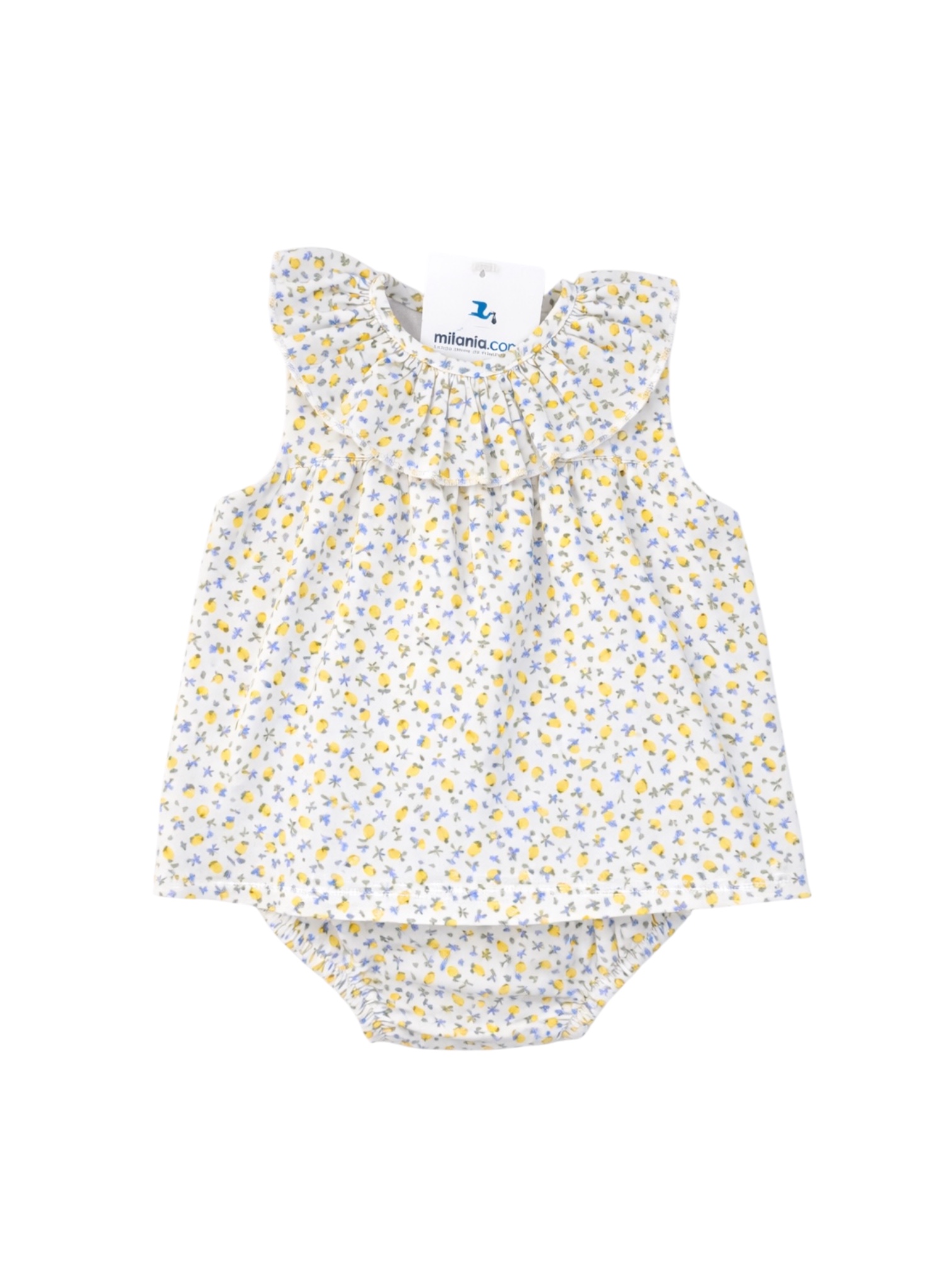 Conjunto para bebé compuesto por blusa sin mangas y cubrepañal a juego. Presenta un delicado estampado  en tonos azul y amarillo sobre fondo blanco, con amplio cuello volante  que aporta un toque romántico y encantador. Confeccionado en tejido ligero y suave para mayor comodidad, es ideal para los días cálidos.