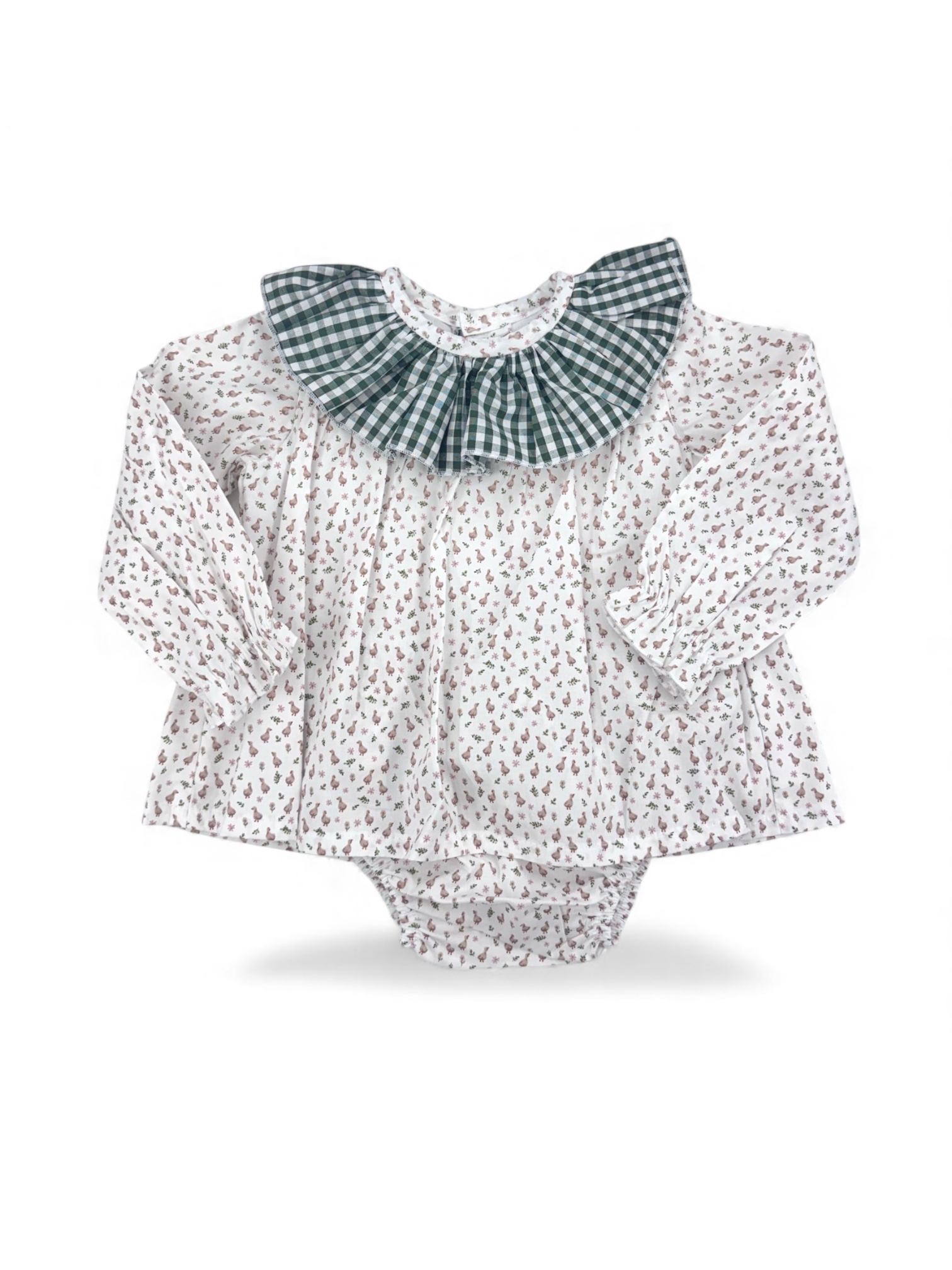 Jesusito confeccionado a mano, elaborado con tejidos suaves y delicados ideales para la piel del bebé. Presenta un encantador estampado  en tonos suaves y un cuello volante de cuadros en contraste, que aporta un toque clásico y especial al diseño.