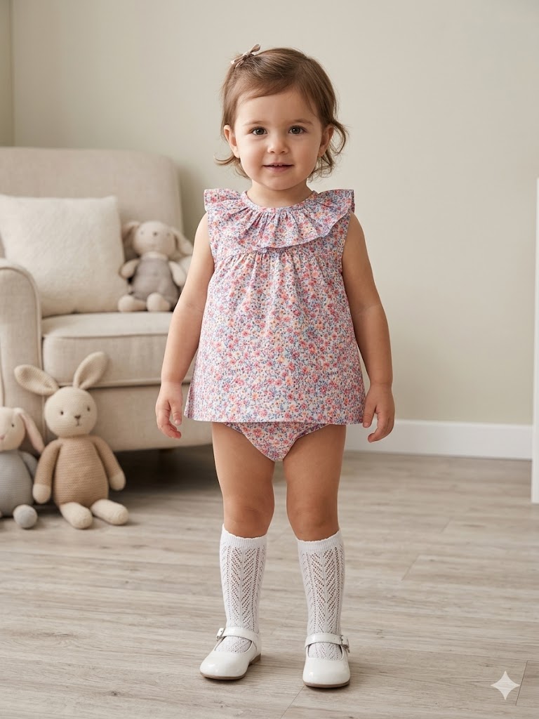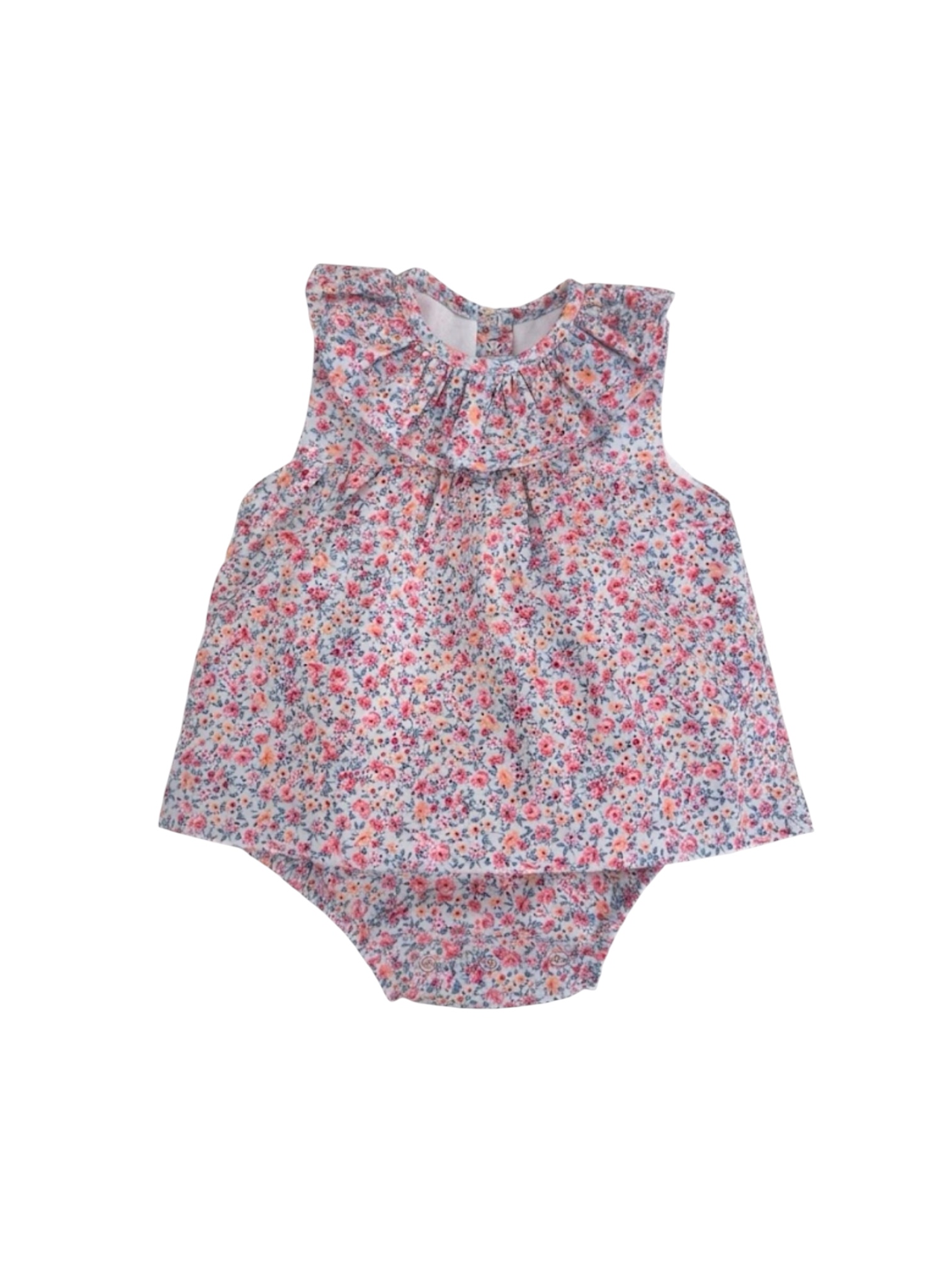 Conjunto de bebé en tejido 100% algodón, suave y transpirable, ideal para el día a día. Diseño floral con volante en el cuello que aporta un toque delicado y encantador. Disponible en talla de 3 a 36 meses. Tallaje normal, se recomienda elegir la talla habitual.