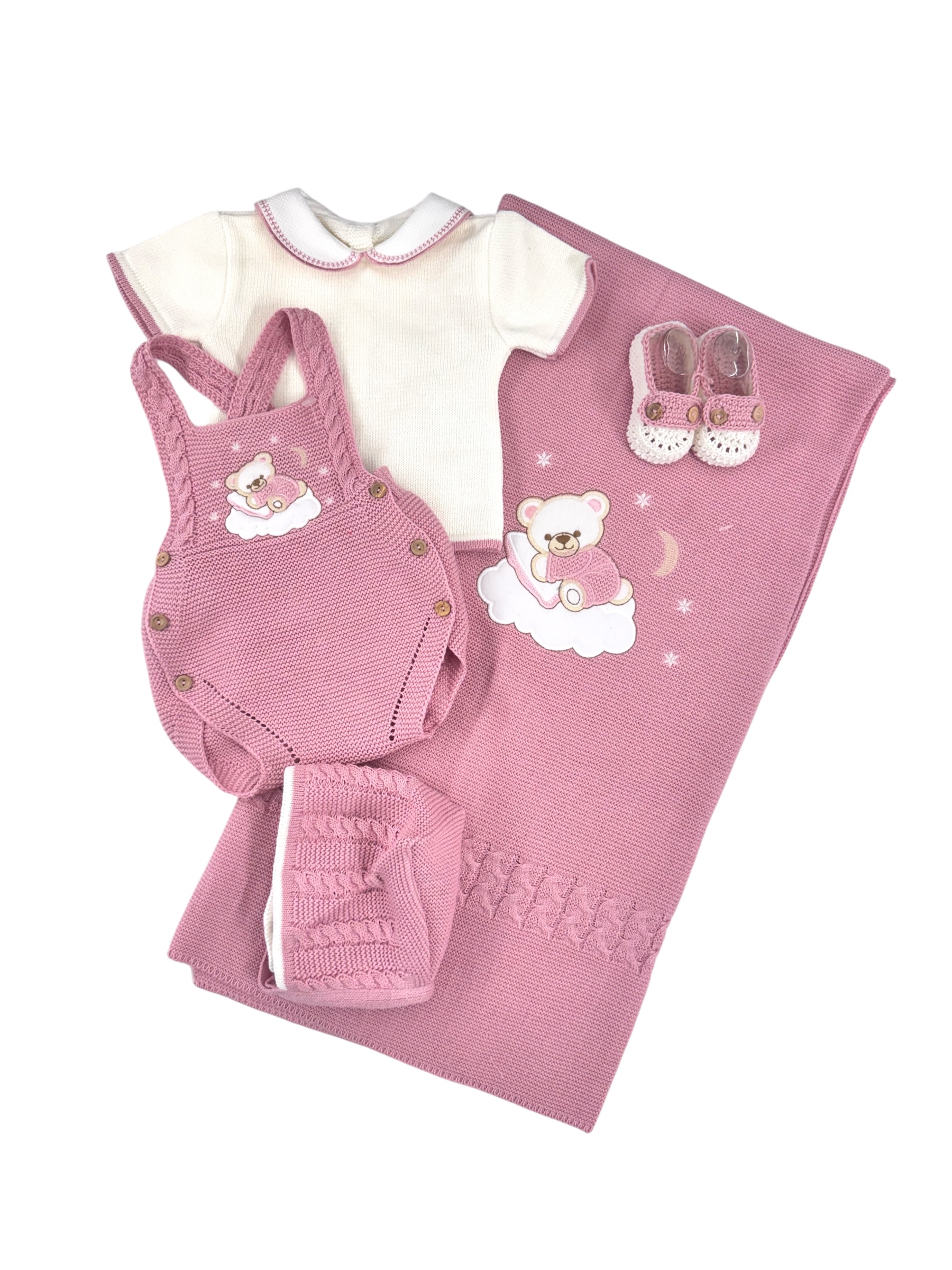 Pack bebé compuesto por toquilla, trajecito de jersey y peto con capota a juego y patucos . Tejido de algodón.