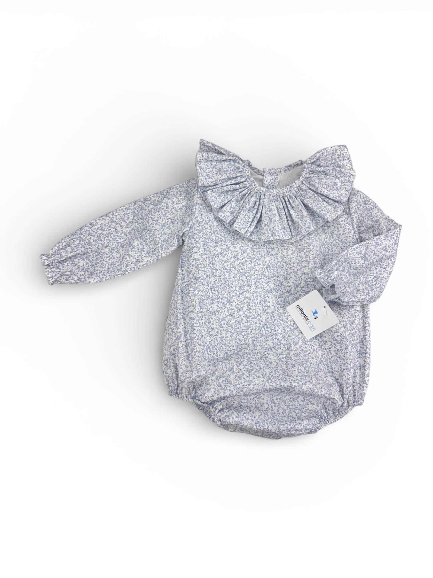 Pelele artesanal confeccionado a mano  y forro interior para mayor comodidad. Diseño delicado con volante en el cuello y acabados cuidados. Tallaje normal, pero al ser pelele se recomienda elegir una talla más de la edad habitual (por ejemplo, para 12 meses elegir talla 18)