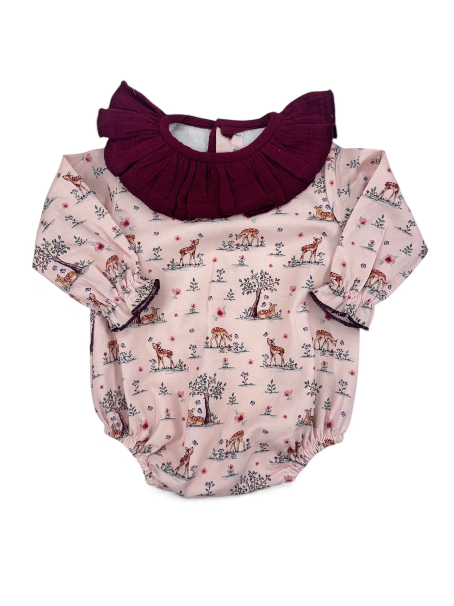 El diseño incluye un volante cuello en tono burdeos, que añade un toque elegante y distintivo, así como mangas fruncidas y acabados elásticos para un ajuste cómodo y favorecedor. La abertura trasera facilita el vestido y desvestido del bebé.