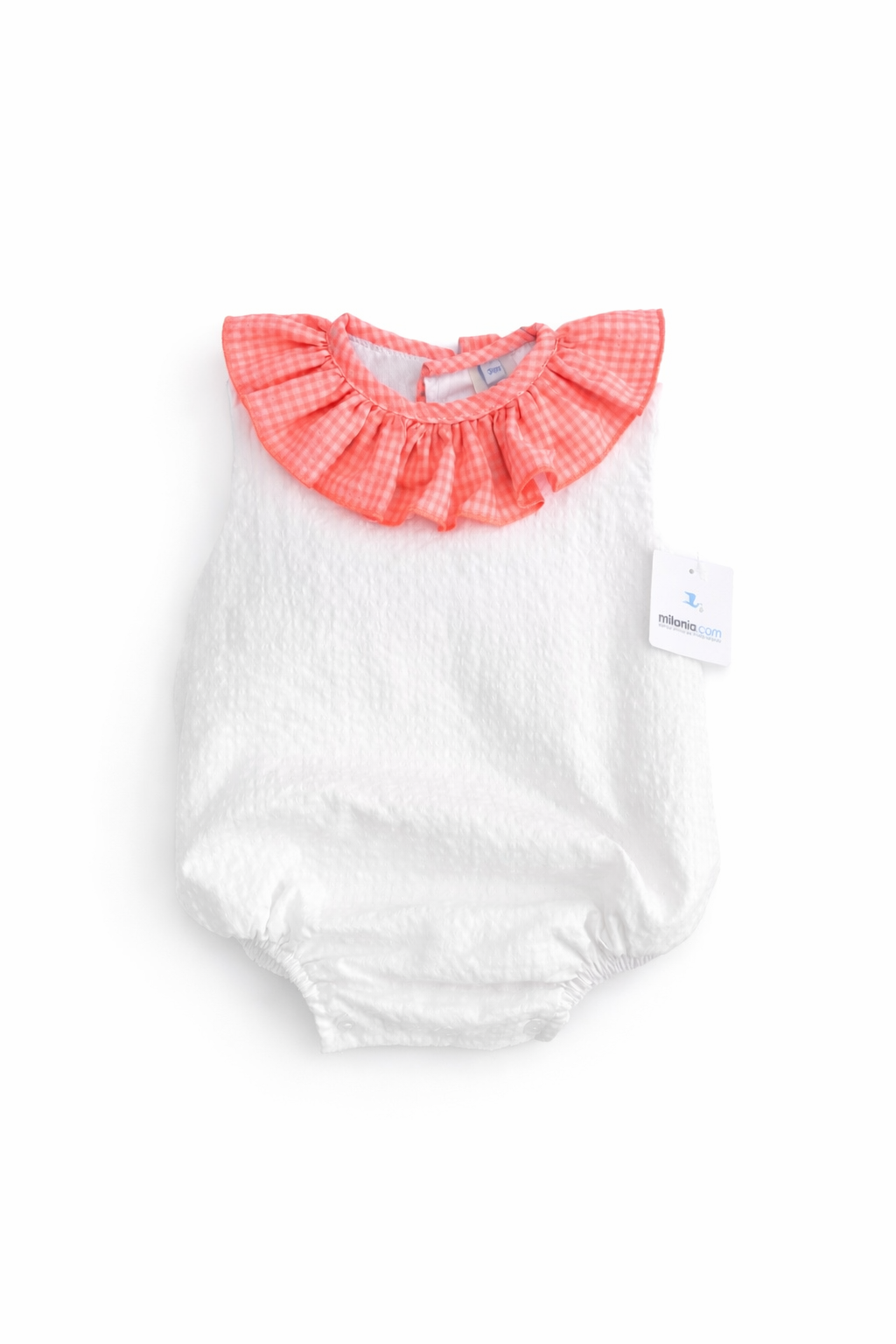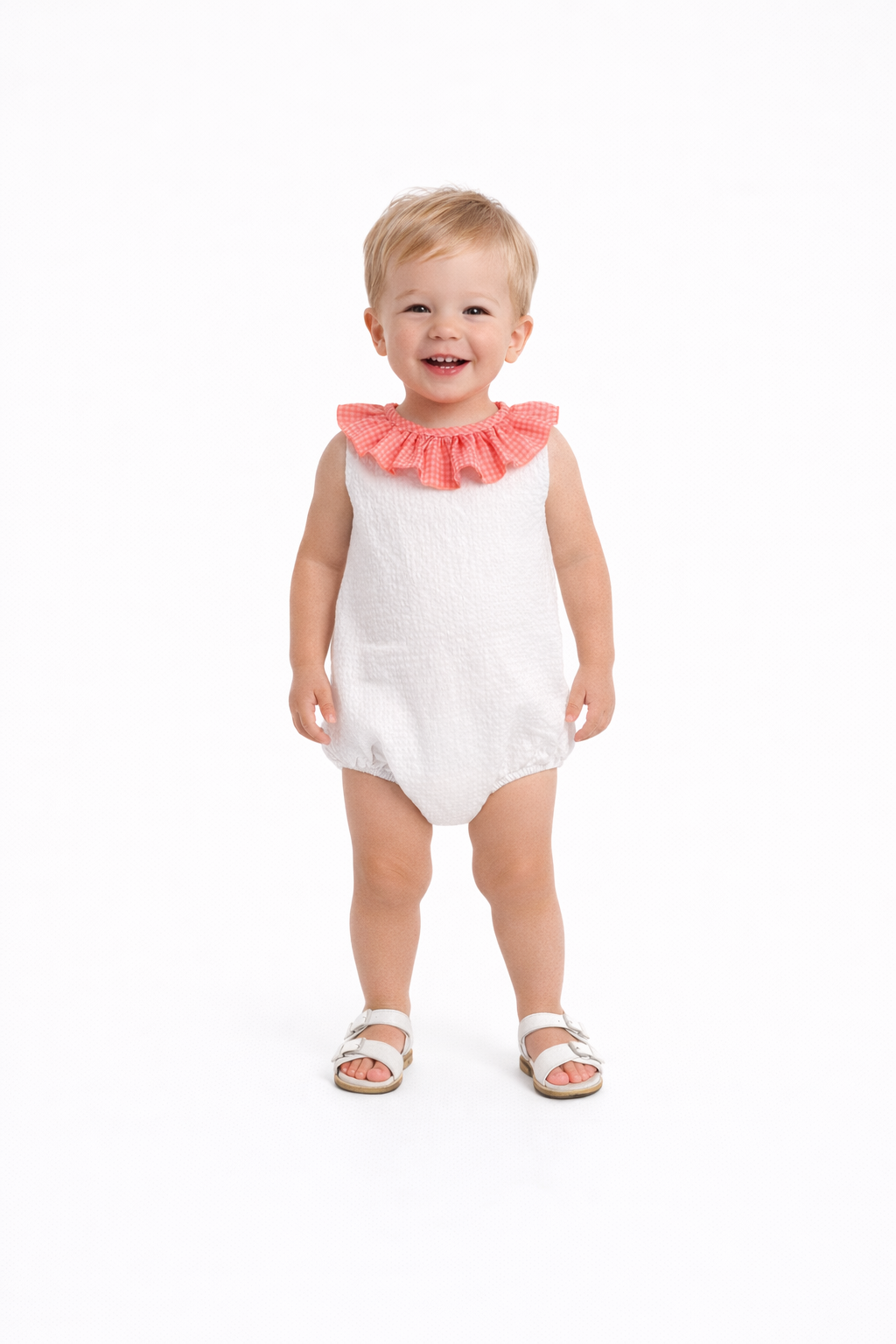 Pelele confeccionado a mano en delicado tejido de algodón, con suave forro interior para mayor comodidad del bebé.