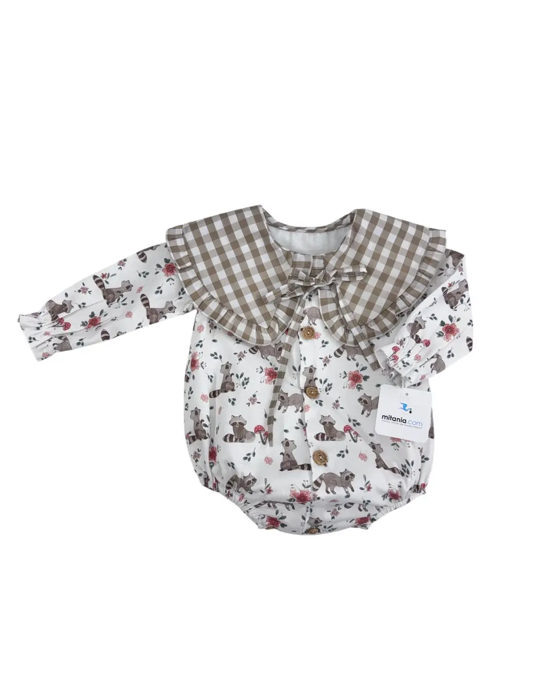 Pelele mapache con forro interior y cuello bebé, el tallaje es normal, pero se recomienda una talla más de la edad. Por ejemplo, para 12 meses una 18.