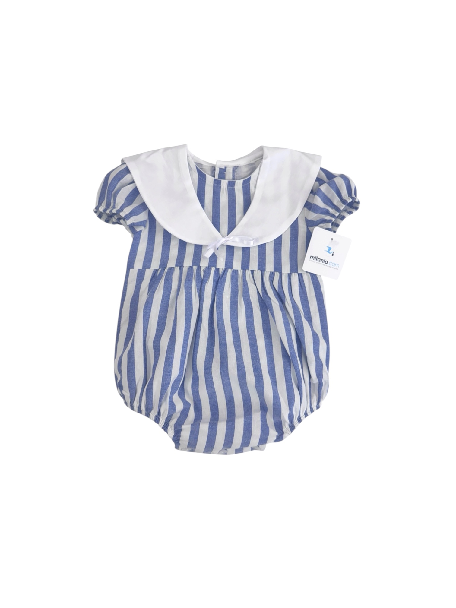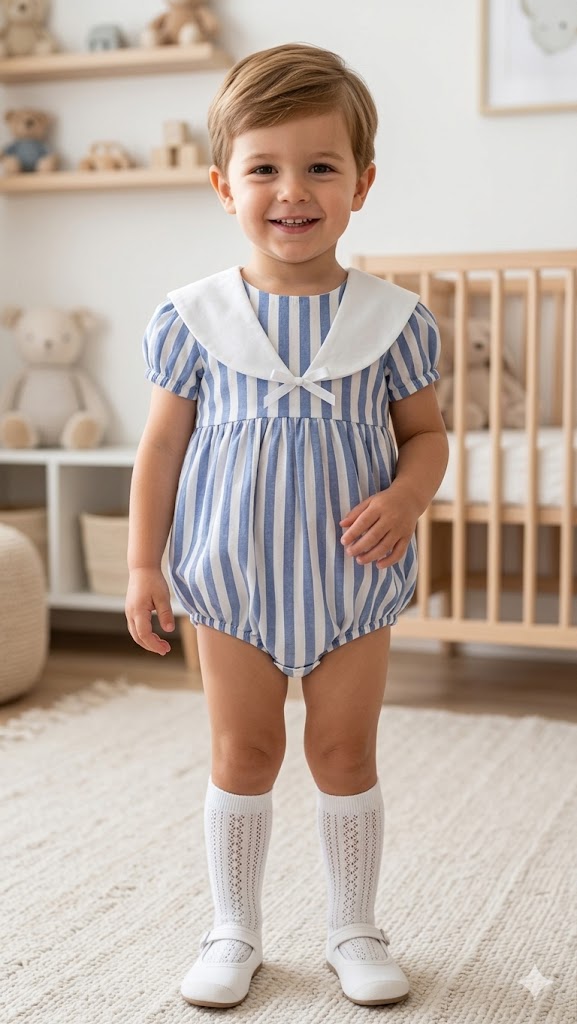• Diseño: Estampado de rayas verticales en azul y blanco, con un elegante cuello babero blanco y detalle de lazada central. Mangas y perneras abullonadas para un estilo dulce y cómodo.