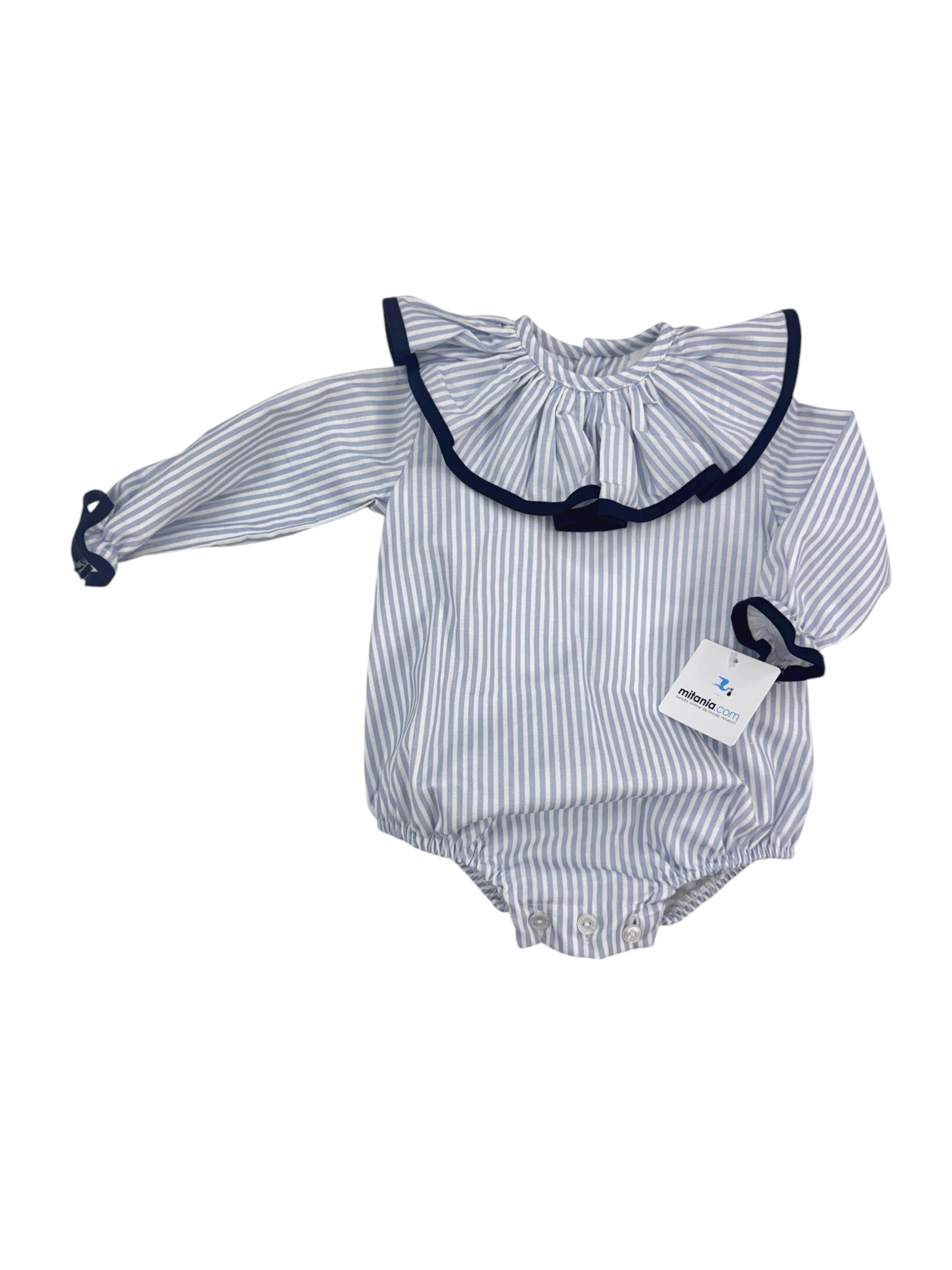 Precioso pelele de rayas celestes y blancas, confeccionado a mano con todo el mimo y cuidado. Su diseño clásico con cuello volante ribeteado en azul marino y detalles en las mangas le aporta un toque elegante y atemporal.