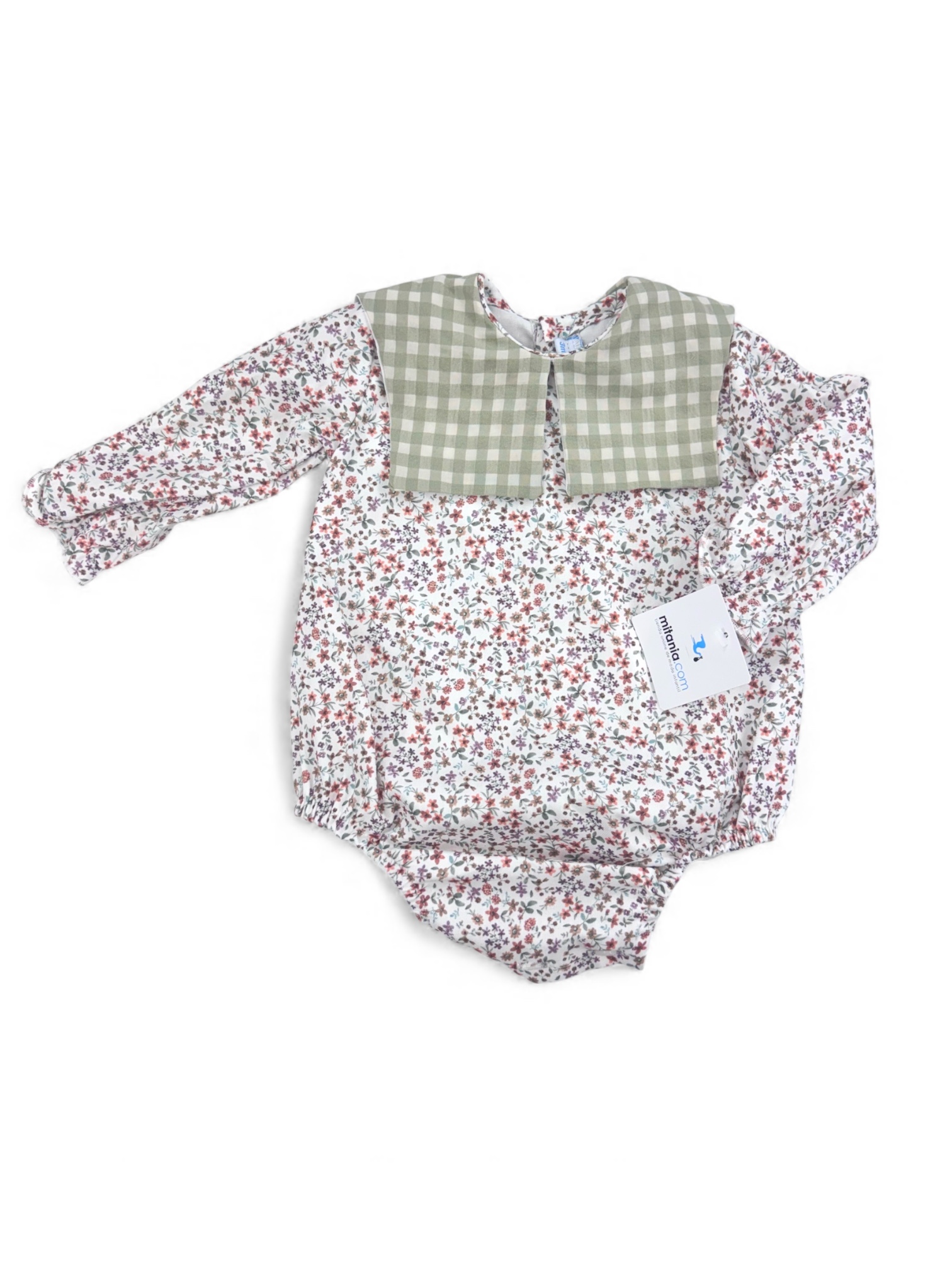 Este precioso pelele está confeccionado a mano con tejidos de alta calidad y un delicado estampado floral combinado con un canesú de cuadros en tono verde suave. Incluye forro interior completo, lo que lo hace cómodo, suave y perfecto para cualquier época del año.
