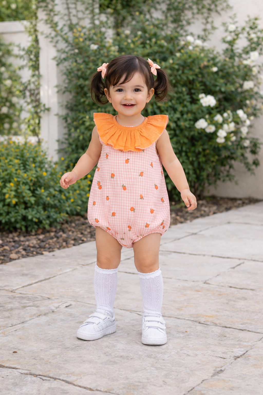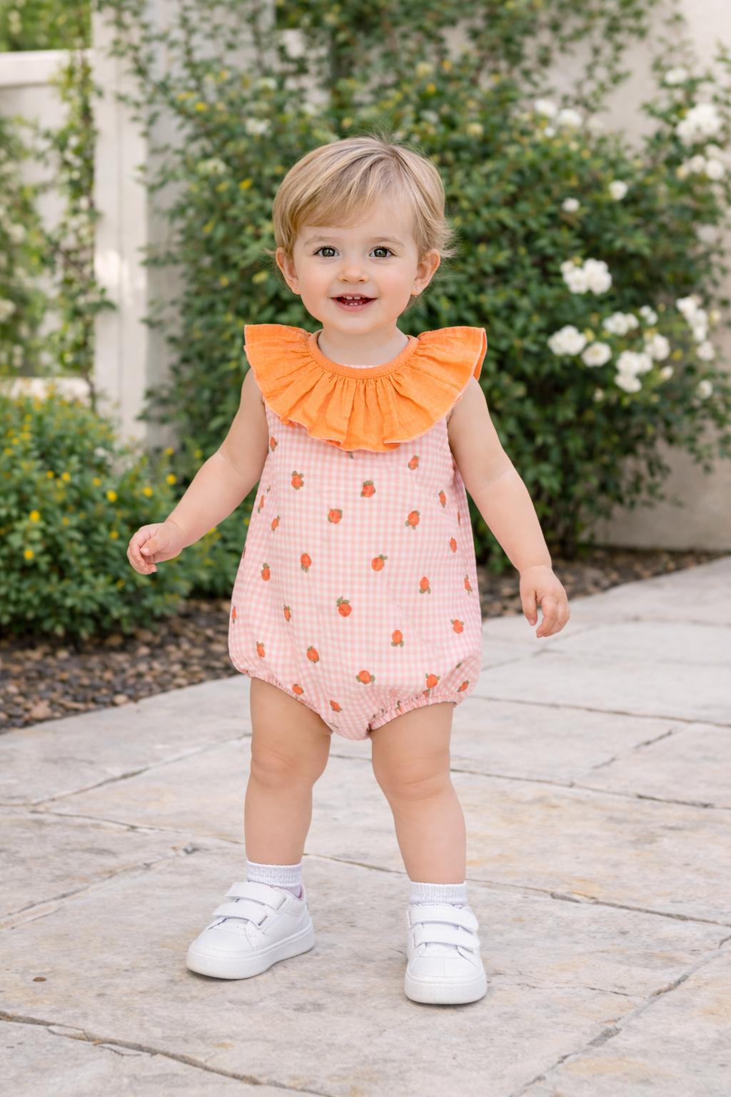 Pelele artesanal de algodón con estampado de melocotones