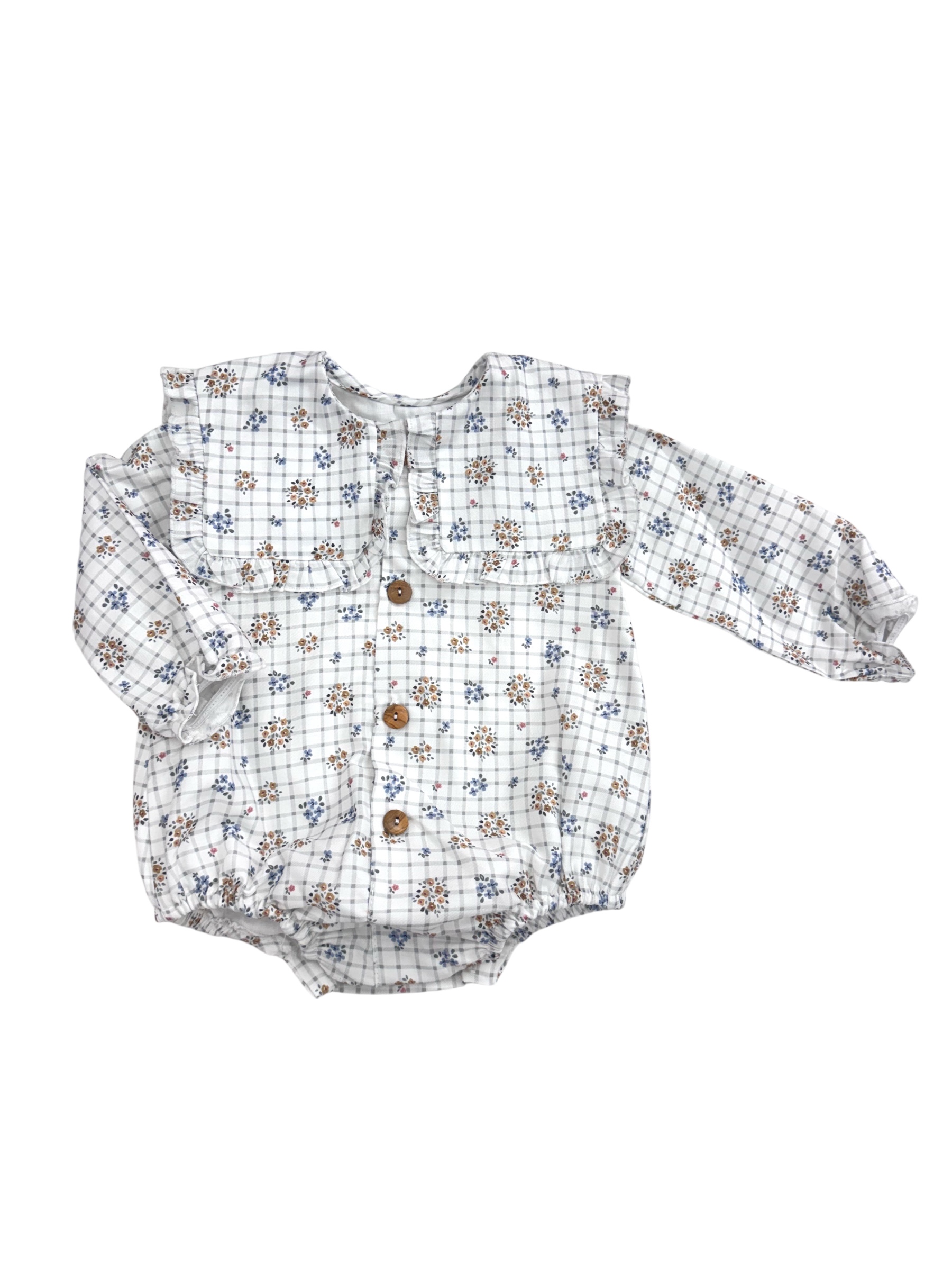 Pelele con forro interior y cuello babero, el tallaje es normal, pero se recomienda una talla más de la edad. Por ejemplo, para 12 meses una 18.
