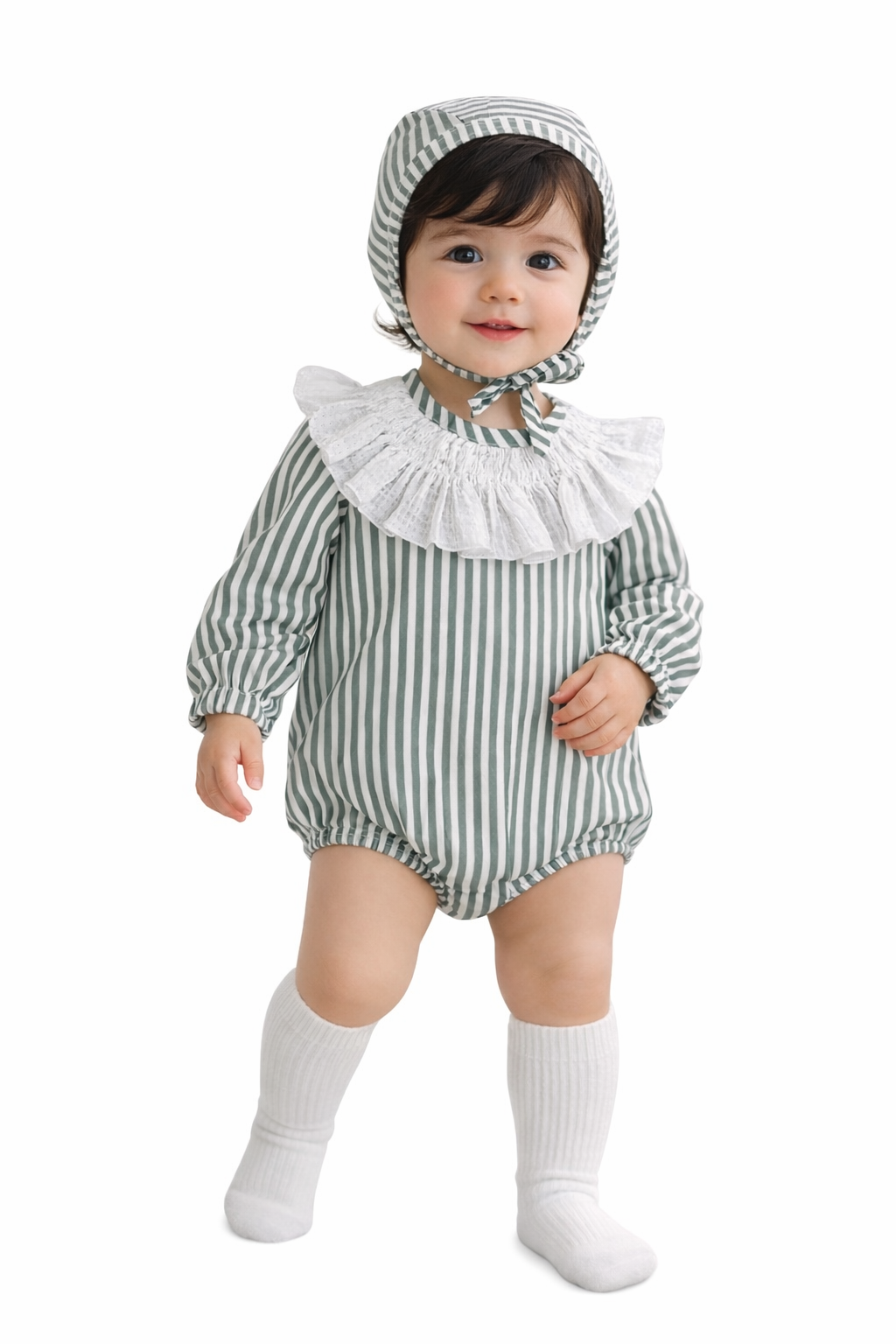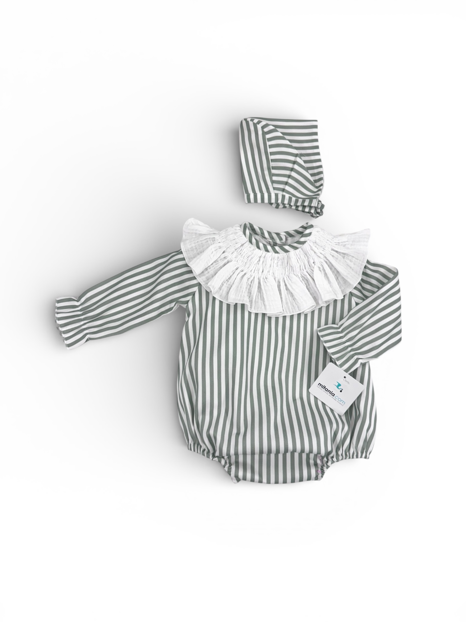 Pelele con capota confeccionado a mano en nuestra colección propia, en tejido de rayas verde empolvado con delicado cuello volante en algodón blanco. Un diseño dulce y atemporal, cómodo y suave para la piel del bebé. Tallaje normal, pero al ser pelele se recomienda elegir una talla más de la edad (por ejemplo, para 12 meses, escoger 18 meses).