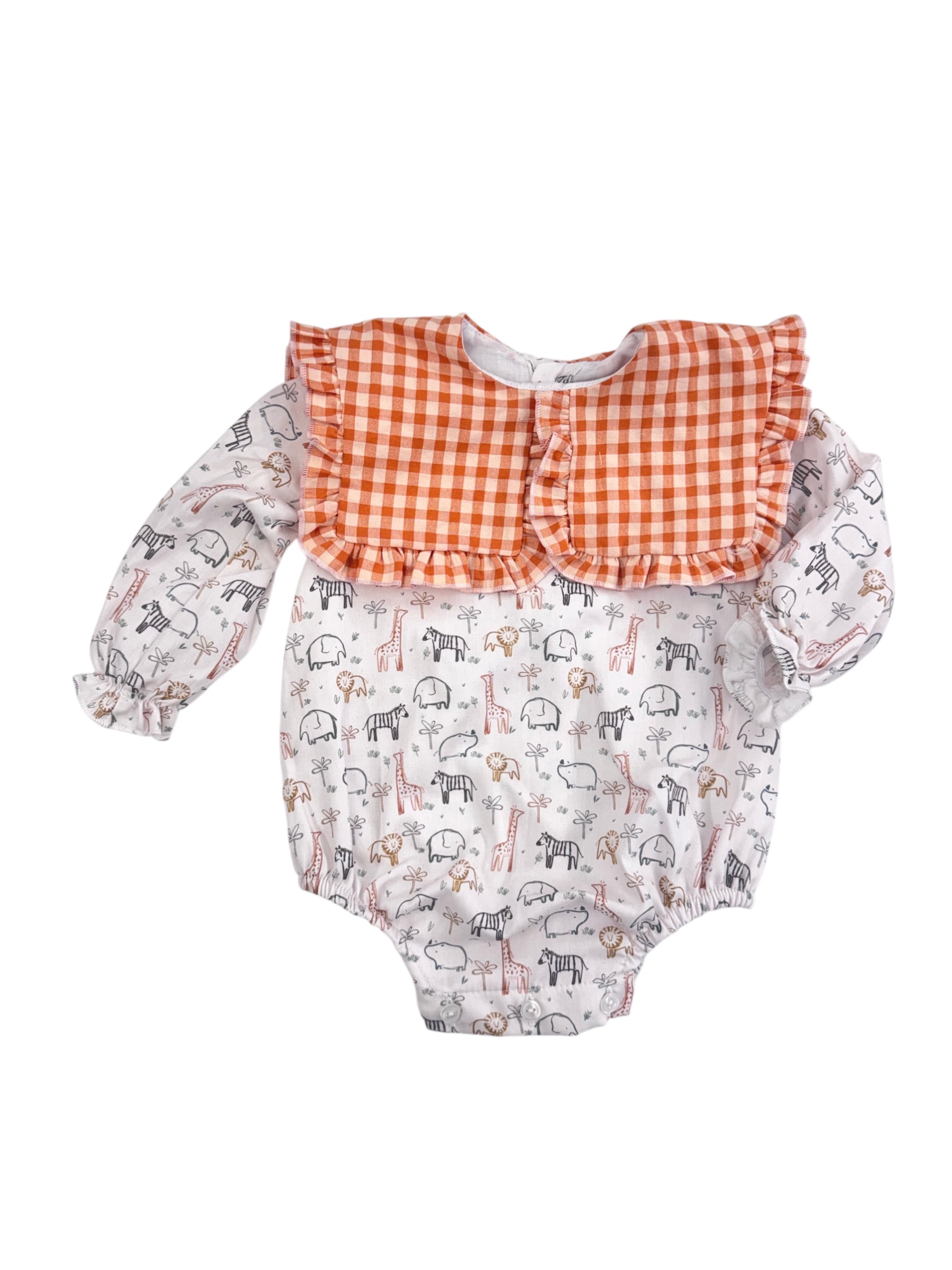 Este encantador pelele está confeccionado a mano con tejidos de alta calidad y cuenta con forro interior, ideal para ofrecer la máxima comodidad y suavidad en contacto con la piel del bebé. Su diseño combina un estampado de animalitos safari en tonos suaves con un cuello amplio de cuadros vichy con volante, creando un estilo dulce y original.