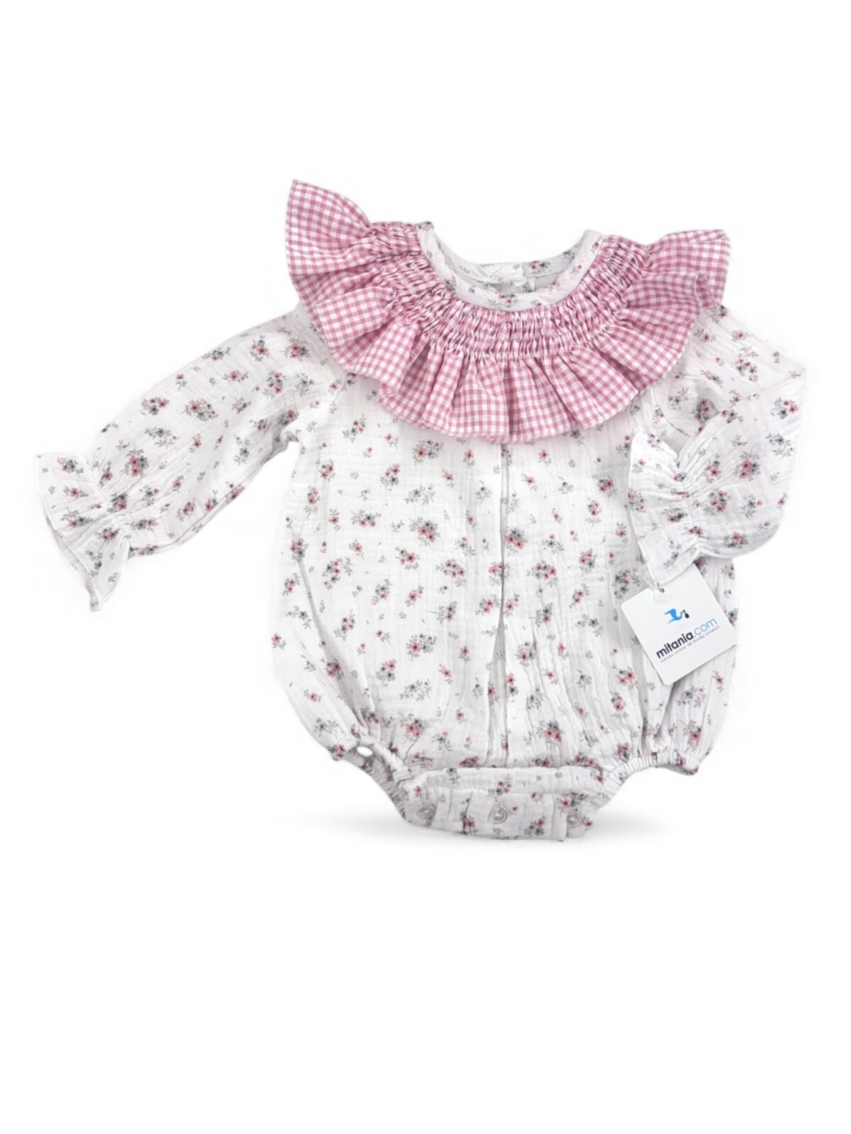 Pelele de bambula confeccionado a mano, suave y ligero, con forro interior y un delicado estampado floral sobre fondo blanco. Presenta un amplio cuello volante en tejido vichy rosa que aporta un toque clásico y muy dulce. Las mangas incluyen un pequeño fruncido en los puños para un ajuste cómodo. El tallaje es normal, aunque se recomienda elegir una talla más de la edad habitual (por ejemplo, para 12 meses, mejor la talla 18) para garantizar un mejor ajuste y mayor comodidad.