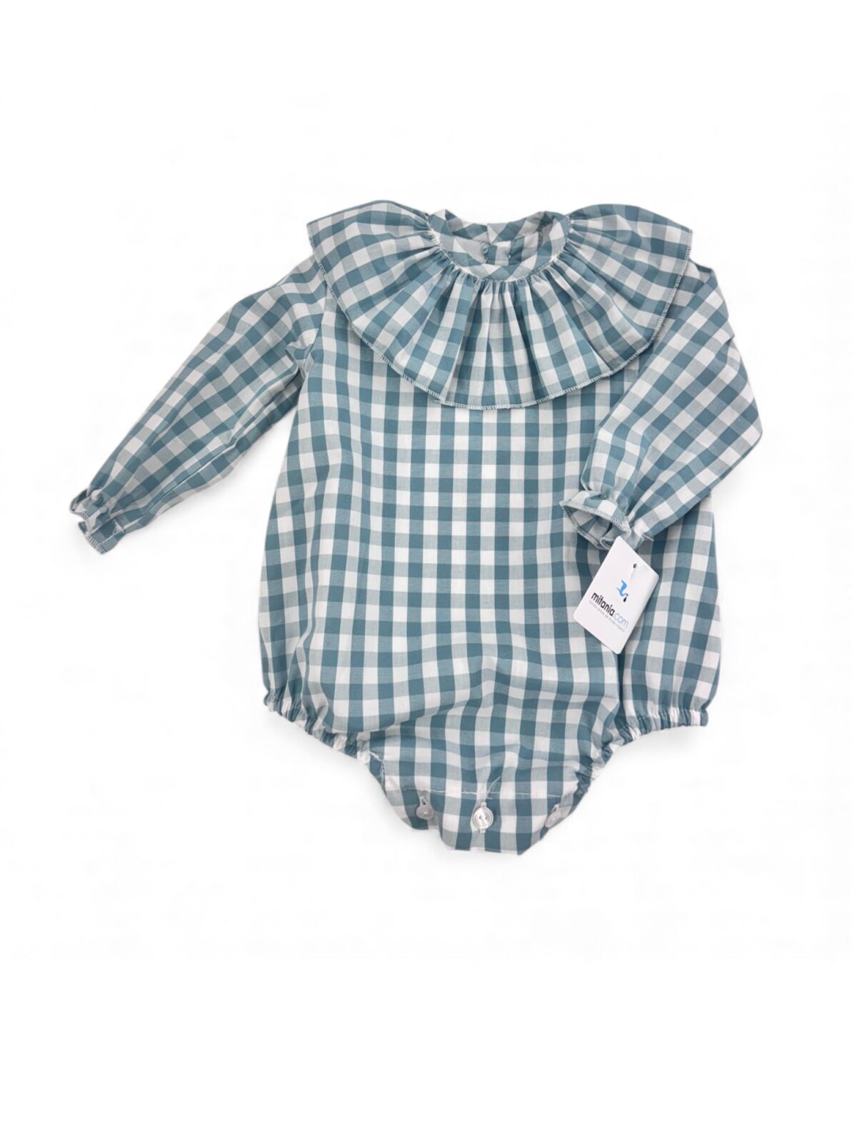 Este encantador pelele está confeccionado a mano en un suave tejido de algodón, perfecto para la delicada piel del bebé. Presenta un elegante estampado de cuadros en tonos verde y blanco, acompañado de un cuello volante amplio que aporta un toque clásico y adorable al diseño.