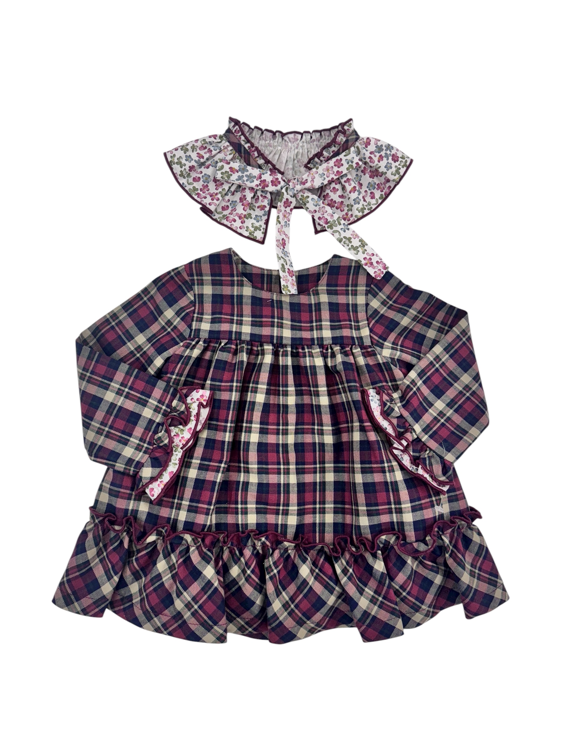 Este encantador vestido infantil combina el estilo clásico con un toque romántico. Confeccionado en una suave tela de cuadros en tonos burdeos, azul marino y beige, presenta un diseño de manga larga ideal. Los delicados volantes en el bajo y los detalles florales en los bolsillos aportan un aire dulce y elegante.